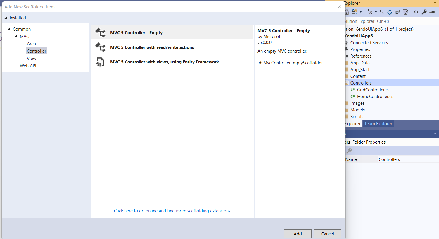 The most likely reason for the missing scaffolding is that the Telerik Extensions are not installed or are disabled. Please review the following screen capture that showcases how to enable them from your Visual Studio Extensions -> Manage Extensions menu.