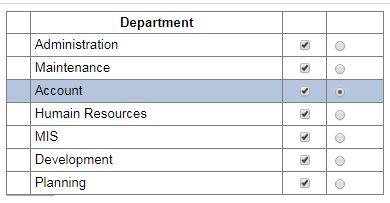 I want based on RadioButton click in the same row checkbox should be checked or unchecked, in the following code if click radio button then all checkbox in the columns is checked.