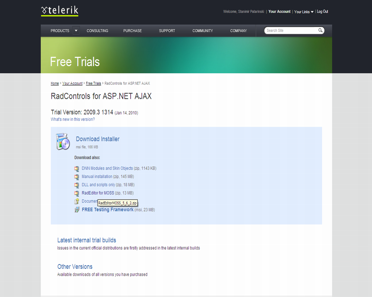 In order to download the latest trial version of RadEditor for MOSS you should go to the Trials section under your account, click on the Visual Studio Extensions, DLLs, Scripts, Source Code, DNN and MOSS wrappers ... link and download the RadEditor for MOSS: (zip, 13 MB) installation. You can see the attached screenshot for more information.