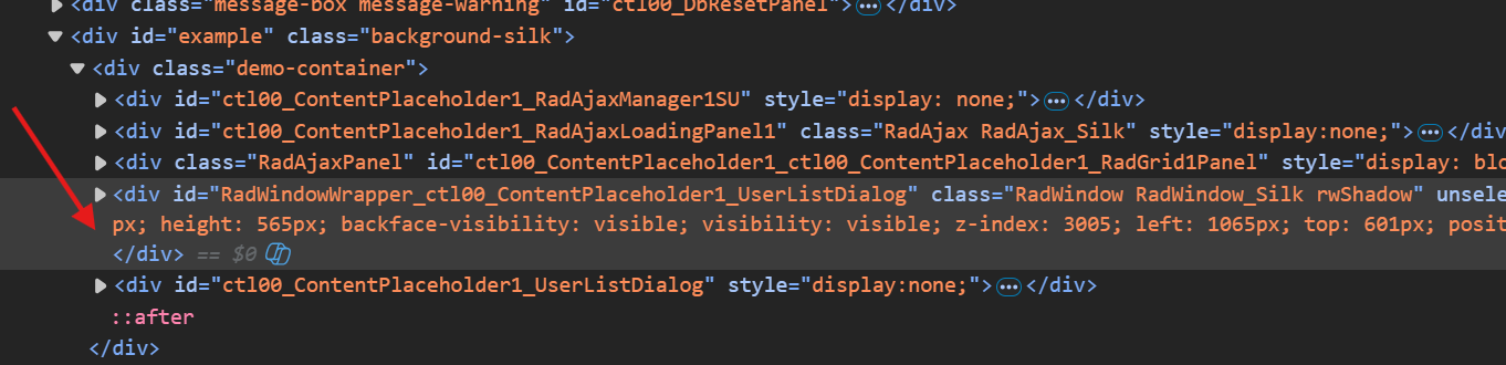 Testing with your Telerik Web UI Window Content Template Demo | Telerik UI for ASP.NET AJAX demo, moving the generated window element "RadWindowWrapper_ctl00_ContentPlaceholder1_UserListDialog" inside its original element "demo-container", kept the demo working perfectly with no side effects.