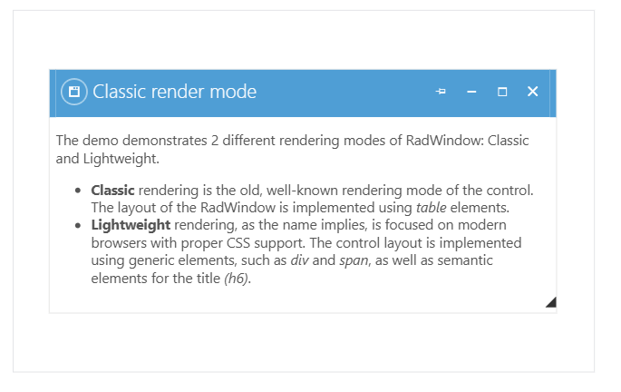 I checked the demo at https://demos.telerik.com/aspnet-ajax/window/examples/rendermodes/defaultcs.aspx?skin=MetroTouch with render mode set to classic in Chrome's Dev Tools > Mobile device emulator. I noticed a vertical line between the td cells in the title bar row as shown in screenshot below. I also noticed a similar issue with Metro skin in classic render mode. If I view the same in non-mobile mode in Chrome then this issue disappears. Perhaps, its some styling issue, but I could not find any CSS causing this.