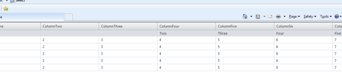 protected void RadGrid_ItemCreated(object sender, GridItemEventArgs e) { if (e.Item is GridGroupHeaderItem) { (e.Item as GridGroupHeaderItem).DataCell.Visible = false; e.Item.PreRender += new EventHandler(Item_PreRender); } } void Item_PreRender(object sender, EventArgs e) { GridGroupHeaderItem groupHeader = sender as GridGroupHeaderItem; if (groupHeader != null) { for (int i = 3; i < groupHeader.OwnerTableView.RenderColumns.Length; i++) { if (groupHeader.OwnerTableView.RenderColumns[i].UniqueName == "ColumnOne") { groupHeader.Cells[i - 1].Text = string.Format("<nobr>{0}</nobr>", "One"); } else if (groupHeader.OwnerTableView.RenderColumns[i].UniqueName == "ColumnTwo") { groupHeader.Cells[i - 1].Text = "Two"; } else if (groupHeader.OwnerTableView.RenderColumns[i].UniqueName == "ColumnThree") { groupHeader.Cells[i - 1].Text = "Three"; } else if (groupHeader.OwnerTableView.RenderColumns[i].UniqueName == "ColumnFour") { groupHeader.Cells[i - 1].Text = "Four"; } else if (groupHeader.OwnerTableView.RenderColumns[i].UniqueName == "ColumnFive") { groupHeader.Cells[i - 1].Text = "Five"; } else if (groupHeader.OwnerTableView.RenderColumns[i].UniqueName == "ColumnSix") { groupHeader.Cells[i - 1].Text = "Six"; } else if (groupHeader.OwnerTableView.RenderColumns[i].UniqueName == "ColumnSeven") { groupHeader.Cells[i - 1].Text = "Seven"; } else if (groupHeader.OwnerTableView.RenderColumns[i].UniqueName == "ColumnEight") { groupHeader.Cells[i - 1].Text = "Eight"; } else if (groupHeader.OwnerTableView.RenderColumns[i].UniqueName == "ColumnNine") { groupHeader.Cells[i - 1].Text = "Nine"; } } }