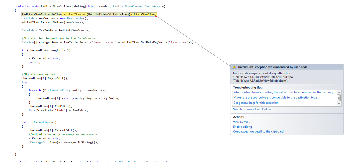 /// <summary> /// Restituisce o imposta la modalità di accesso alla form /// </summary> [Bindable(BindableSupport.Yes, BindingDirection.TwoWay)] public SchedulerFormMode Modalita { get; set; } // qui non è necessario usare il viewstate perchè non viene agganciata da un datareader /// <summary> /// Restituisce o imposta il titolo della form /// </summary> [Bindable(BindableSupport.Yes, BindingDirection.TwoWay)] public string FormTitle { get; set; } // qui non è necessario usare il viewstate perchè non viene agganciata da un datareader /// <summary> /// Restituisce o imposta l'id dell'attività /// </summary> [Bindable(BindableSupport.Yes, BindingDirection.TwoWay)] public int AppointmentId { get { return Convert.ToInt32(this.ViewState["AppointmentId"]); } set { this.ViewState["AppointmentId"] = value; } } /// <summary> /// Restituisce o imposta l'oggetto dell'attività /// </summary> [Bindable(BindableSupport.Yes, BindingDirection.TwoWay)] public string Subject { get { return this.ViewState["Subject"].ToString(); } set { this.ViewState["Subject"] = value; } } /// <summary> /// Restituisce o imposta l'autore dell'attività /// </summary> [Bindable(BindableSupport.Yes, BindingDirection.TwoWay)] public string Author { get { return this.ViewState["Author"].ToString(); } set { this.ViewState["Author"] = value; } } /// <summary> /// Restituisce o imposta a descrizione dell'attività /// </summary> [Bindable(BindableSupport.Yes, BindingDirection.TwoWay)] public string Description { get { return this.ViewState["Description"].ToString(); } set { this.ViewState["Description"] = value; } } /// <summary> /// Restituisce o imposta la data e l'ora di inizio dell'attività /// </summary> [Bindable(BindableSupport.Yes, BindingDirection.TwoWay)] public DateTime Start { get { return Convert.ToDateTime(this.ViewState["Start"]); } set { this.ViewState["Start"] = value; } } /// <summary> /// Restituisce o imposta la data e l'ora di fine dell'attività /// </summary> [Bindable(BindableSupport.Yes, BindingDirection.TwoWay)] public DateTime End { get { return Convert.ToDateTime(this.ViewState["End"]); } set { this.ViewState["End"] = value; } } /// <summary> /// Restituisce o imposta la regola di ripetizione dell'attività /// </summary> [Bindable(BindableSupport.Yes, BindingDirection.TwoWay)] public string RecurrenceRule { get { return this.ViewState["RecurrenceRule"].ToString(); } set { this.ViewState["RecurrenceRule"] = value; } } /// <summary> /// Restituisce o imposta la regole di promemoria dell'attività /// </summary> [Bindable(BindableSupport.Yes, BindingDirection.TwoWay)] public string Reminders { get { return this.ViewState["Reminders"].ToString(); } set { this.ViewState["Reminders"] = value; } }protected void Scheduler_AppointmentUpdate(object sender, AppointmentUpdateEventArgs e) { SchedulerTask taskToEdit = Scheduler[Convert.ToInt32(e.Appointment.ID)]; taskToEdit.Comments = e.ModifiedAppointment.Description; taskToEdit.StartTime = e.ModifiedAppointment.Start; taskToEdit.EndTime = e.ModifiedAppointment.End; taskToEdit.Subject = e.ModifiedAppointment.Subject; taskToEdit.Tipologia = e.ModifiedAppointment.Resources.GetResourceByType("Tipologia") != null ? (TipologiaTask)Convert.ToInt32(e.ModifiedAppointment.Resources.GetResourceByType("Tipologia").Key) : TipologiaTask.Varie_Note; taskToEdit.Reminder = e.ModifiedAppointment.Reminders.ToString(); taskToEdit.Recurrence = e.ModifiedAppointment.RecurrenceRule; taskToEdit.RecurrenceParentID = e.ModifiedAppointment.RecurrenceParentID; taskToEdit.Stato = StatoTask.MODIFICA; taskToEdit.Salva(); this.schGestioneLocazioni.DataSource = Scheduler.CopyToDataTable(); } protected void Scheduler_AppointmentInsert(object sender, AppointmentInsertEventArgs e) { try { // recupero la tipologia selezionata dall'utente tramite la finestra modale di editing // se non ha impostato nulla imposto io una tipologia di default TipologiaTask tipologia = e.Appointment.Resources.GetResourceByType("Tipologia") == null ? TipologiaTask.Property_Management_Note : (TipologiaTask)Convert.ToInt32(e.Appointment.Resources.GetResourceByType("Tipologia").Key); string autore = e.Appointment.Attributes["Autore"] == null ? SchedulerConstants.Autori.SCH_AUTORE_SYS : e.Appointment.Attributes["Autore"].ToString(); SchedulerTask taskToAdd = Scheduler.NewSchedulerTask( e.Appointment.Subject, // oggetto e.Appointment.Description, // descrizione e.Appointment.Start, // inizio e.Appointment.End, // fine tipologia, // tipologia e.Appointment.Reminders.ToString(), // promemoria (basta fare il ToString della Collection e ottengo il reminder formattato e.Appointment.RecurrenceRule, // regola di ricorrenza e.Appointment.RecurrenceParentID, // parent ID StatoTask.INSERIMENTO, SchedulerTaskAvvisato.NO, autore, DateTime.Now); Scheduler.Add(taskToAdd); this.schGestioneLocazioni.DataSource = Scheduler.CopyToDataTable(); RadAjaxManager.GetCurrent(this).Alert("Appointment was inserted successfully."); } catch (SqlForeignKeyConstraintException ex) { RadAjaxManager.GetCurrent(this).Alert(ex.Message); } catch (SqlException ex) { RadAjaxManager.GetCurrent(this).Alert(ex.Message); } catch (Exception) { RadAjaxManager.GetCurrent(this).Alert(MessaggiException.Exception); } } protected void Scheduler_AppointmentCommand(object sender, AppointmentCommandEventArgs e) { Control SchedulerAdvancedForm; switch (e.CommandName.ToLower()) { case "insert": SchedulerAdvancedForm = e.Container.FindControl("advTemplateInsert"); break; case "update": Scheduler.ReadTasks(); // rileggo per avere eventuali nuove task inserite sul db SchedulerAdvancedForm = e.Container.FindControl("advTemplateEdit"); break; default: SchedulerAdvancedForm = e.Container.FindControl("advTemplateInsert"); break; } if (SchedulerAdvancedForm != null) { e.Container.Appointment.Subject = ((RadTextBox)SchedulerAdvancedForm.FindControl("txtAdvInsertSubject")).Text; e.Container.Appointment.Description = ((RadTextBox)SchedulerAdvancedForm.FindControl("txtAdvInsertDescri