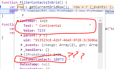 This is where it gets weird. If I click to focus the cell containing my cascaded CustomerContact dropdown, and then click off without actually expanding the dropdown, the value changes from being the whole object to just the DataValueField ("Value" in my case). I've checked and sure enough the datasource change event is triggered when i click off of the cell for the CustomerContact dropdown even though I haven't opened it. This doesn't happen to the Customer dropdown, so it must be something with the cascade but I really can't understand what is causing it. Code below and some screenshots of before and after click my second dropdown's cell. Any help would be appreciated!
