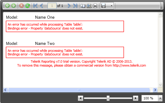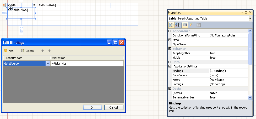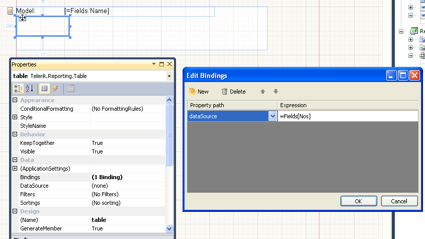 using System.Collections.Generic;using System.Linq;using Telerik;using Telerik.Reporting;namespace MyReport{ public partial class MainWindow { public MainWindow() { InitializeComponent(); var project = new List<Project>(); var pro = new Project {Name = "Name One", Nos = new List<int> {1, 2, 3, 4, 5}}; project.Add(pro); pro = new Project {Name = "Name Two", Nos = new List<int> {1, 2, 3, 4, 5}}; project.Add(pro); var reportSource = new InstanceReportSource {ReportDocument = new SampleReport()}; reportSource.ReportDocument.Reports.FirstOrDefault(rep => rep.Name == "SampleReport").DataSource = project; reportViewer1.ReportSource = reportSource; } private class Project { public string Name { get; set; } public List<int> Nos { get; set; } } }}I know that problem is with my bindings.