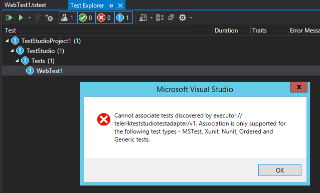 I try to associate a test created in Telerik Test Studio project to TFS test case but I get the error (on the picture)