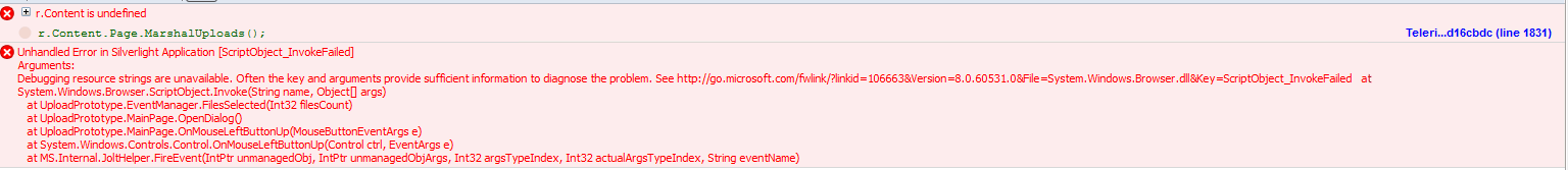Upload failing in FF 6.0 with Silverlight enabled. Same upload works great in IE 9, Chrome 14+. When Silverlight is disabled, FF6 upload is fine. Javascript console error is attached as screenshot.