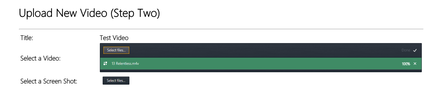 Hi sorry, I think I totally forgot to mention what the problem was. On the UI view, it showed that the video was uploaded "Done". But the actual file was never uploaded. Currently, I'm just testing on my local host. I selected a 16mb video file to test in the screenshot provided. Is there something wrong with my codes?