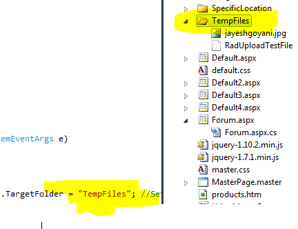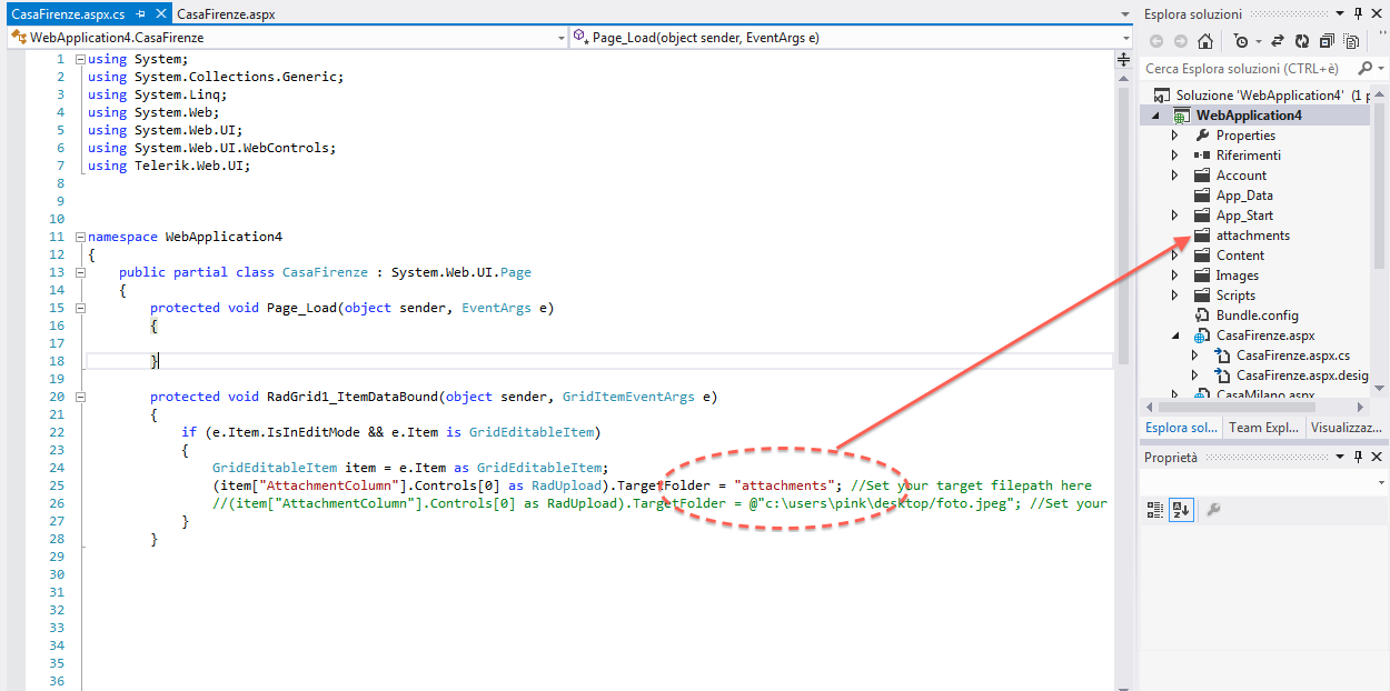 using System;using System.Collections.Generic;using System.Linq;using System.Web;using System.Web.UI;using System.Web.UI.WebControls;using Telerik.Web.UI;namespace WebApplication4{ public partial class CasaFirenze : System.Web.UI.Page { protected void Page_Load(object sender, EventArgs e) { } protected void RadGrid1_ItemDataBound(object sender, GridItemEventArgs e) { if (e.Item.IsInEditMode && e.Item is GridEditableItem) { GridEditableItem item = e.Item as GridEditableItem; (item["AttachmentColumn"].Controls[0] as RadUpload).TargetFolder = "attachments"; //Set your target filepath here //(item["AttachmentColumn"].Controls[0] as RadUpload).TargetFolder = @"c:\users\pink\desktop/foto.jpeg"; //Set your target filepath here } }0