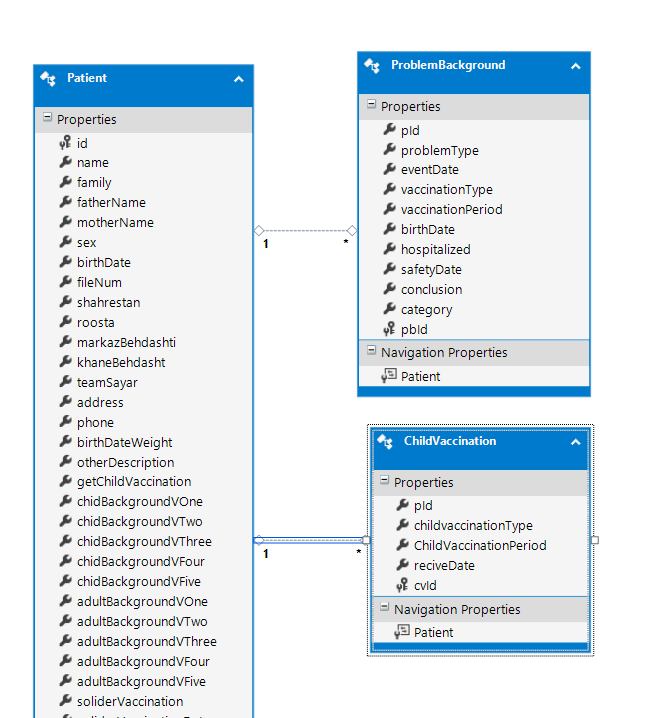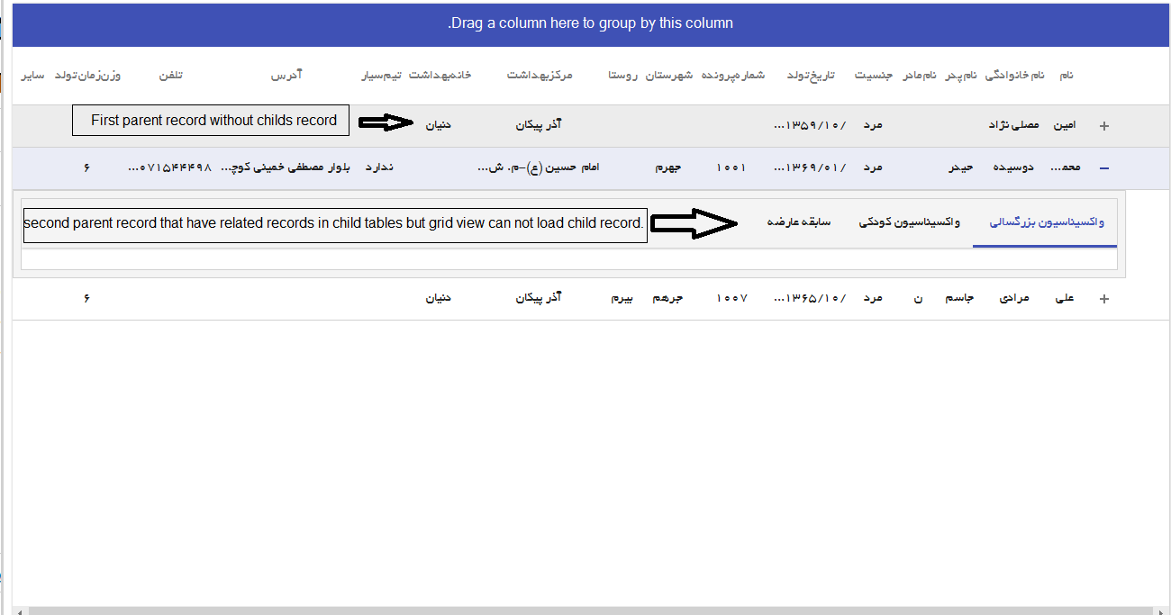 The Patient table is Parent and 3 other are children (one to many relations). Now if the first record of the Patient table that retrieves to grid data source has no related record in 3 other tables, the grid does not display child's records for other parent table records. shown in picture 02.png.