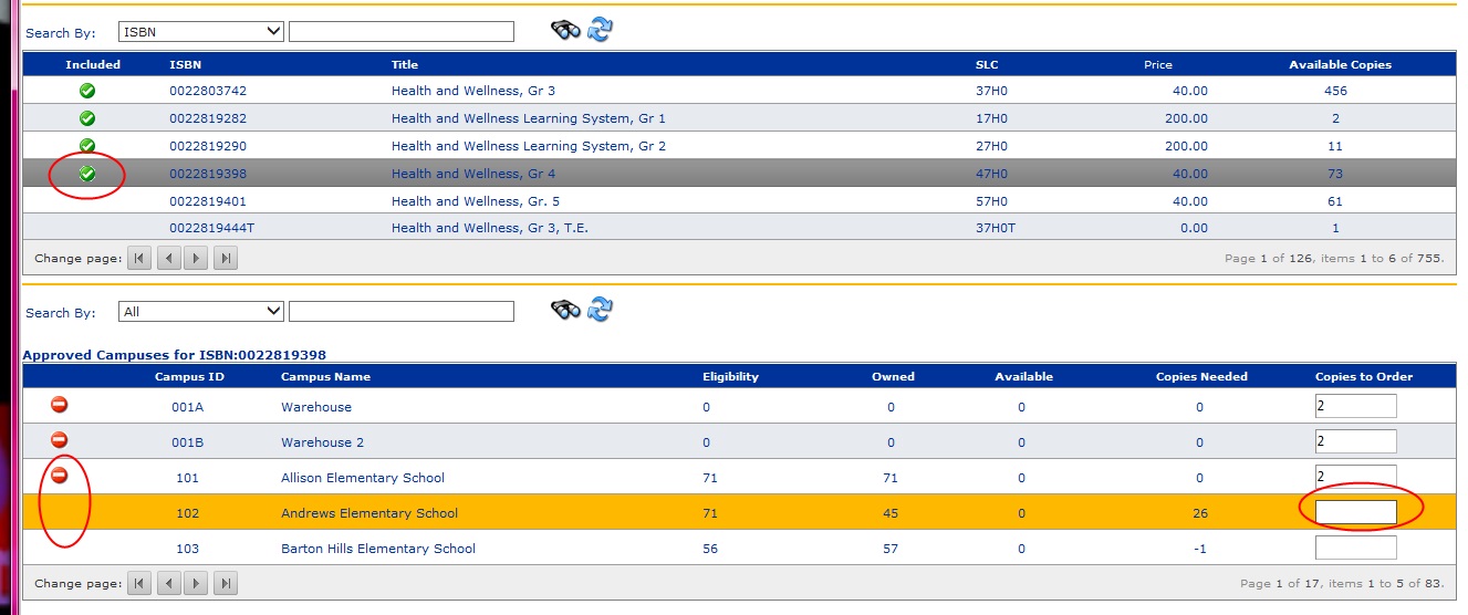 A user clicks the upper grid which is a list of books. When they select a book from the upper grid, a lower grid will appear which will allow them to select which campuses will receive this book.