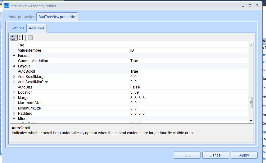 You do not need to set the AutoScroll property of RadTreeView. This property appears because the control inherits from RadControl. Nevertheless, it automatically shows the scroll bars when is needed. If you still want to do it, you should do it programmatically. I will not consider this behavior as issue, because the controls does not support it. We will hide the property from the design time in one of the next releases.