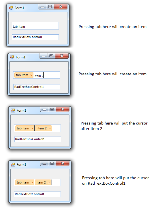 Pressing tab while typing in the AutoCompleteTextbox will create an item. If the tab key is pressed after an item has been created it will move the curor to the next item in the list. If the cursor is on the last item then normal tab functionality is used and the next tabbable control has focus.