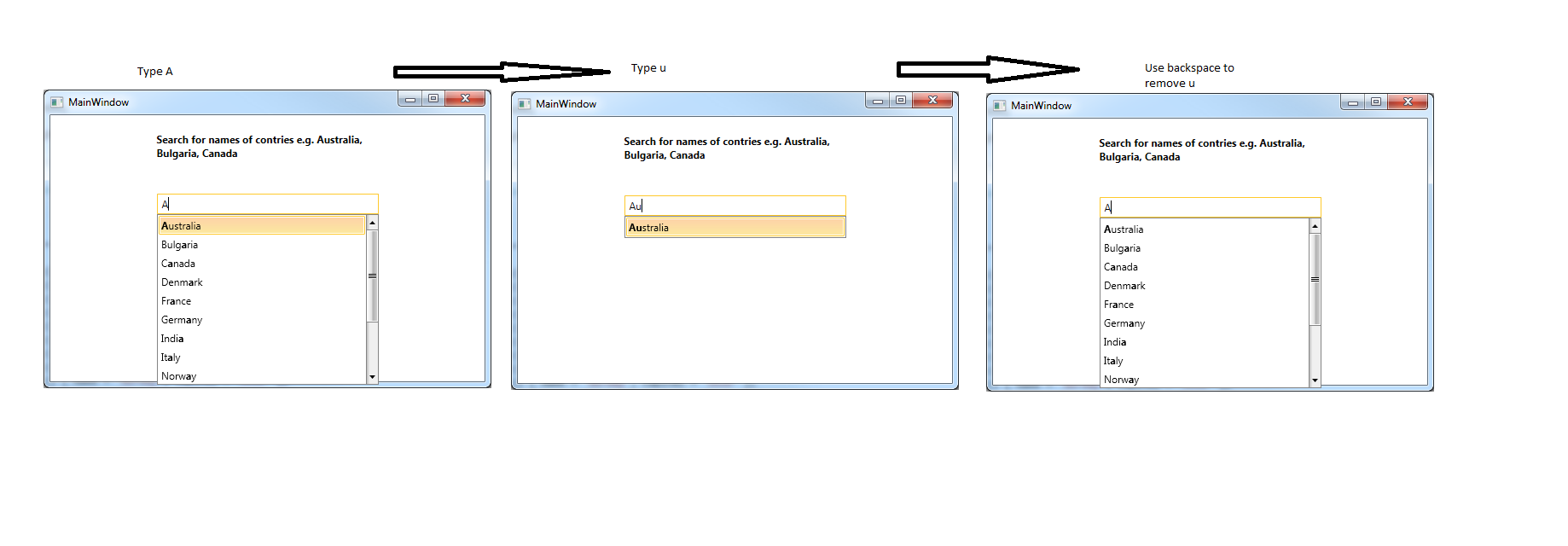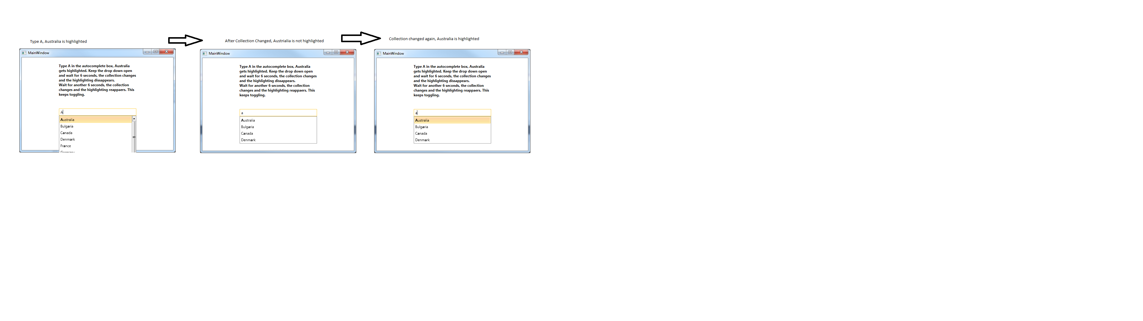 using System;using System.Collections.Generic;using System.Collections.ObjectModel;using System.Linq;using System.Text;using System.Threading;using Telerik.Windows.Controls;namespace HighlightMatchingItemsText{ public class Country { public string Name { get; set; } public string Capital { get; set; } } public class ViewModel : ViewModelBase { private ObservableCollection<Country> countries; public ViewModel() { this.Countries = new ObservableCollection<Country>() { new Country() { Name = "Australia", Capital = "Canberra" }, new Country() { Name = "Bulgaria", Capital = "Sofia" }, new Country() { Name = "Canada", Capital = "Ottawa" }, new Country() { Name = "Denmark", Capital = "Copenhagen" }, new Country() { Name = "France", Capital = "Paris" }, new Country() { Name = "Germany", Capital = "Berlin" }, new Country() { Name = "India", Capital = "New Delhi" }, new Country() { Name = "Italy", Capital = "Rome" }, new Country() { Name = "Norway", Capital = "Oslo" }, new Country() { Name = "Russia", Capital = "Moscow" }, new Country() { Name = "Spain", Capital = "Madrid" }, new Country() { Name = "United Kingdom", Capital = "London" }, new Country() { Name = "United States", Capital = "Washington, D.C." }, }; var o = System.Reactive.Linq.Observable.Start(() => { //starts on a background thread. while (true) { Thread.Sleep(6000); this.Countries = new ObservableCollection<Country>() { new Country() { Name = "Australia", Capital = "Canberra" }, new Country() { Name = "Bulgaria", Capital = "Sofia" }, new Country() { Name = "Canada", Capital = "Ottawa" }, new Country() { Name = "Denmark", Capital = "Copenhagen" }, }; Console.WriteLine("Collection Changed"); } }); } public ObservableCollection<Country> Countries { get { return this.countries; } set { if (this.countries != value) { this.countries = value; this.OnPropertyChanged(() => this.Countries); } } } }}<UserControl x:Class="HighlightMatchingItemsText.Example" xmlns:telerik="http://schemas.telerik.com/2008/xaml/presentation" xmlns:local="clr-namespace:HighlightMatchingItemsText" mc:Ignorable="d" d:DesignHeight="300" d:DesignWidth="300" Width="300"> <UserControl.DataContext> <local:ViewModel /> </UserControl.DataContext> <Grid> <Grid.RowDefinitions> <RowDefinition Height="Auto"/> <RowDefinition Height="Auto"/> <RowDefinition Height="Auto"/> </Grid.RowDefinitions> <TextBlock Text="Type A in the autocomplete box, Australia gets highlighted. Keep the drop down open and wait for 6 seconds, the collection changes and the highlighting dissappears. Wait for another 6 seconds, the collection changes and the highlighting reappaers. This keeps toggling. " TextWrapping="Wrap" FontWeight="Bold" Margin="20"/> <telerik:RadAutoCompleteBox x:Name="AutoComplete" Grid.Row="1" Margin="20" ItemsSource="{Binding Countries}" TextSearchPath="Name" TextSearchMode="Contains" AutoCompleteMode="Suggest" > </telerik:RadAutoCompleteBox> </Grid></UserControl>