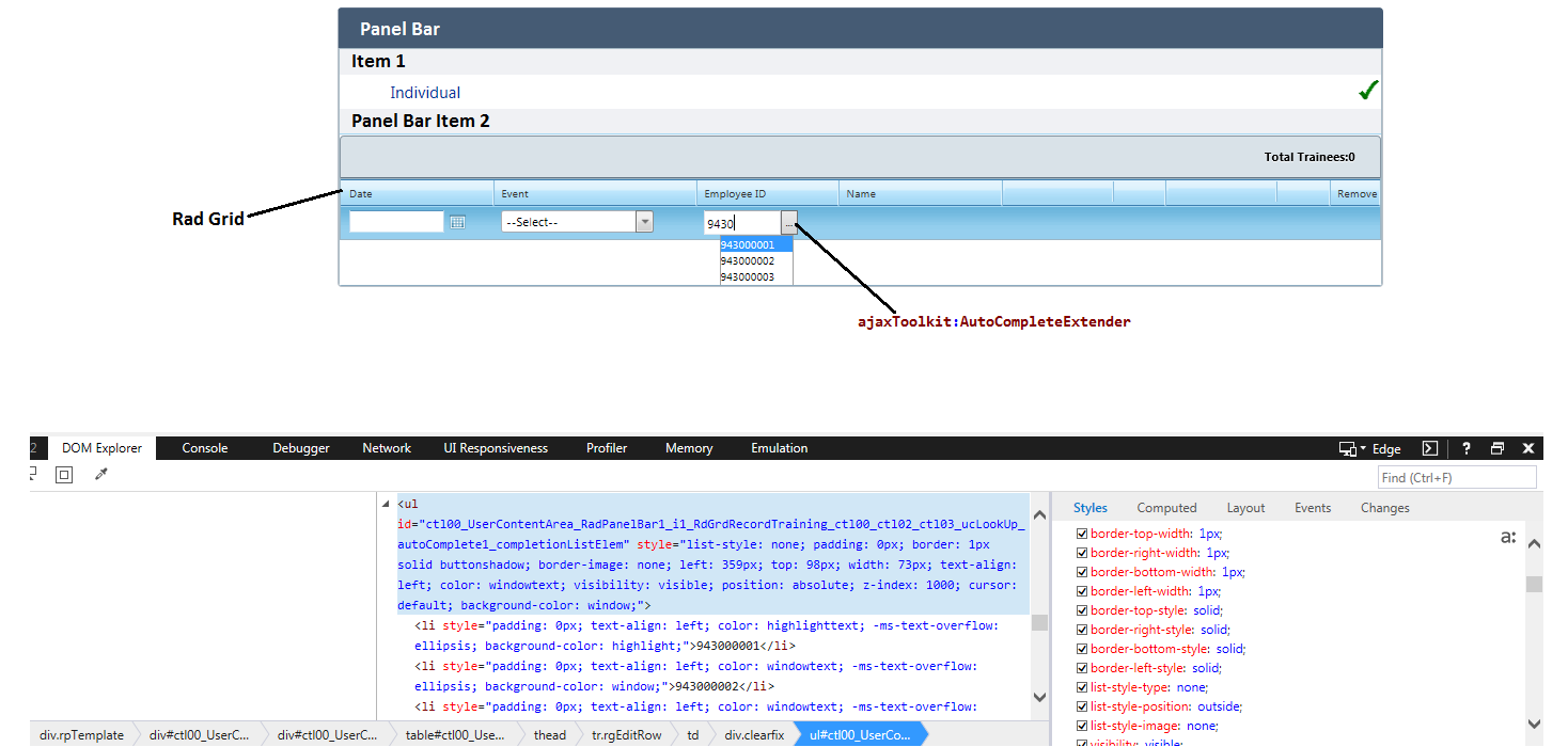 I have a RadPanel Bar and Panel items inside that. I have a grid view in which there is a textbox with autocomplete extender feature.