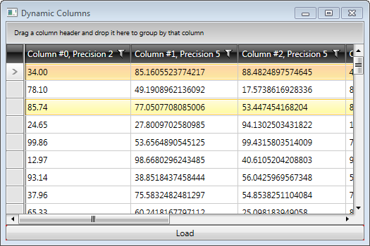 namespace DynamicColumns.Data{ public class ColumnMetadata { public string Name { get; set; } public string Alias { get; set; } public int Precision { get; set; } }}MainView.xaml