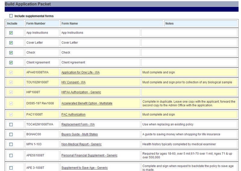 Furthermore, once the user is within a particular carrier's app wizard, they will eventually reach a forms selection page, where the minimum required forms for the application packet are automatically selected, along with any forms that become required based on answers to preceding questions about the applicant in the previous wizard pages. Furthermore, the user can select additional forms to include in the packet. All forms work is done within a Repeater ASP.NET control (see second screenshot).