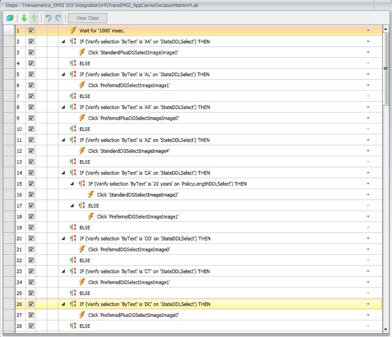 One solution I've come up with and have had moderate success with has involved creating a sort of "decision matrix" for both the carrier selection page and the forms page, where, given a data-driven context, the buttons/checkboxes that need to be selected for each individual iteration are recorded into script and nested within if/else statements. See the third screenshot - note that buttons are set to be clicked only given certain conditions, so that the location of the "Transamerica" button is known for each iteration of the test.
