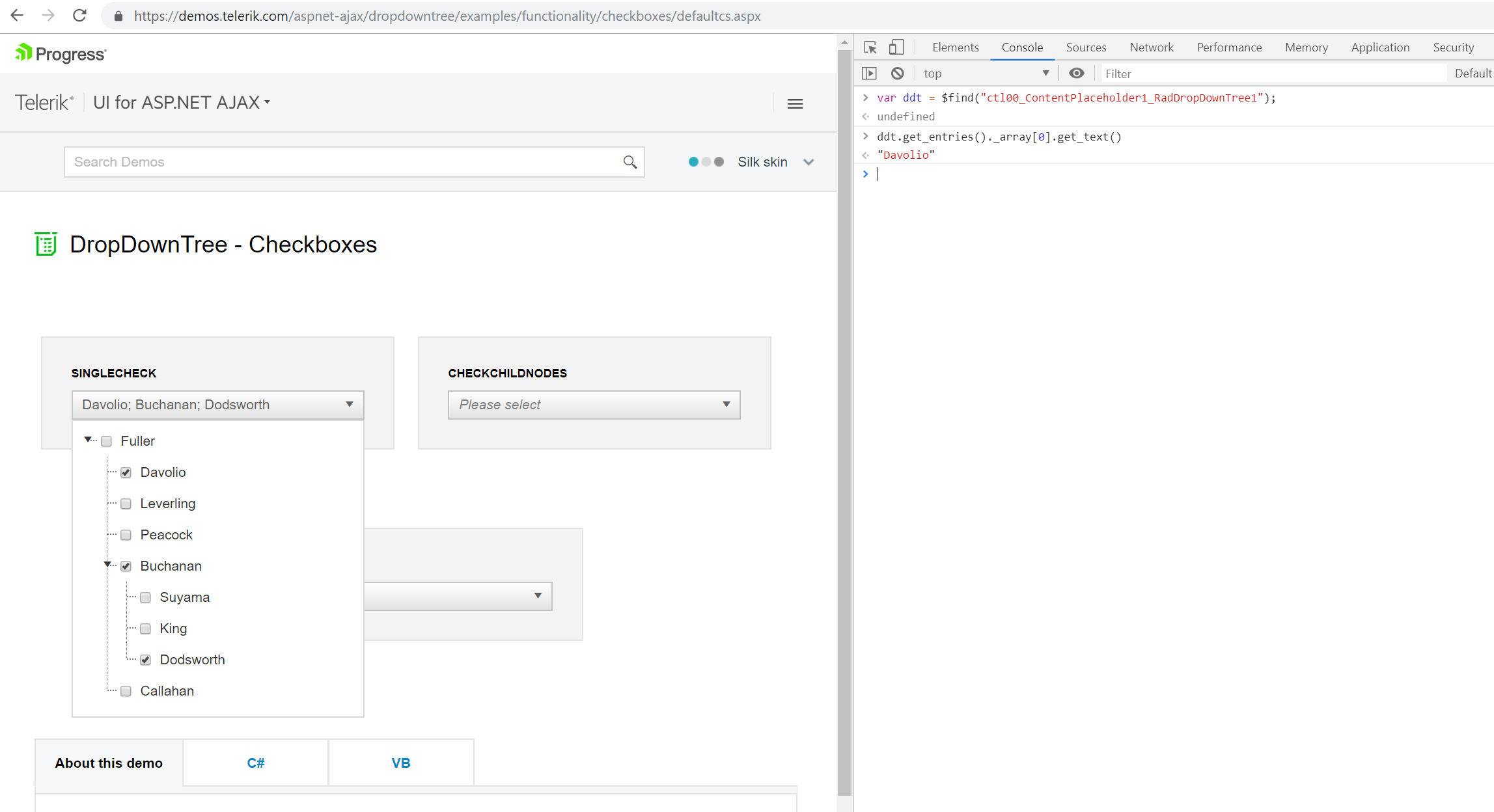 Protected Sub Unnamed_Click(ByVal sender As Object, ByVal e As EventArgs) For Each node As RadTreeNode In RadDropDownTree1.EmbeddedTree.Nodes If node.GetAllNodes().Count <> 0 Then For Each subnode As RadTreeNode In node.GetAllNodes() checkedNode += subnode.Text & " " + subnode.Checked.ToString() & vbLf MultiBox1.Text = checkedNode Next End If NextEnd SubRegards,