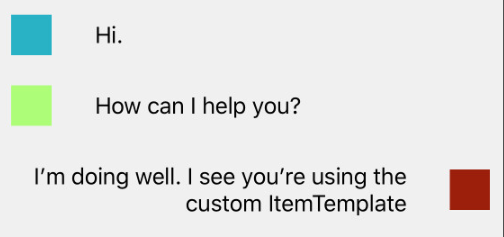 public class MainPageViewModel : NotifyPropertyChangedBase{ public MainPageViewModel() { // Both authors have a byte[] as the profile image source this.Me = new ExtendedAuthor { Name = "human", ProfileImageSource = ImageSource.FromStream(() => new MemoryStream(GenerateProfileImageBytes())) }; this.Bot = new ExtendedAuthor { Name = "Bot", ProfileImageSource = ImageSource.FromStream(() => new MemoryStream(GenerateProfileImageBytes())) }; this.Items = new ObservableCollection<SimpleChatItem>(); // Simulate async data loading Device.StartTimer(TimeSpan.FromMilliseconds(500), () => { this.Items.Add(new SimpleChatItem { Author = this.Bot, Text = "Hi." }); this.Items.Add(new SimpleChatItem { Author = this.Bot, Text = "How can I help you?" }); return false; }); } public ExtendedAuthor Me { get; set; } public ExtendedAuthor Bot { get; set; } public ObservableCollection<SimpleChatItem> Items { get; set; } private byte[] GenerateProfileImageBytes() { using (var bmp = new SKBitmap(36, 36)) { var rand = new Random(); var r = (byte)rand.Next(0, byte.MaxValue); var g = (byte)rand.Next(0, byte.MaxValue); var b = (byte)rand.Next(0, byte.MaxValue); var color = new SKColor(r, g, b, 255); for (int i = 0; i < bmp.Width; i++) { for (int j = 0; j < bmp.Height; j++) { bmp.SetPixel(i, j, color); } } using (SKImage image = SKImage.FromPixels(bmp.PeekPixels())) { var data = image.Encode(SKEncodedImageFormat.Png, 100); return data.ToArray(); } } }}Next, we need to define an "out of the box" ChatItemTemplateSelector that will let us use our own DataTemplate for the chat items. This can initially appear complicated with the number of templates, but it's actually straightforward. I've written in some code comments to clarify