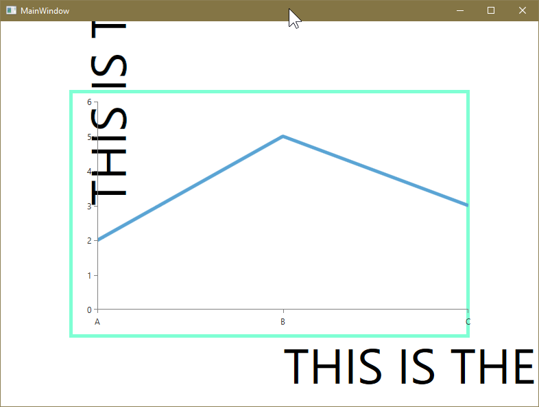 <Window x:Class="WpfApplication2.MainWindow" xmlns="http://schemas.microsoft.com/winfx/2006/xaml/presentation" xmlns:x="http://schemas.microsoft.com/winfx/2006/xaml" xmlns:telerik="http://schemas.telerik.com/2008/xaml/presentation" xmlns:wpfApplication2="clr-namespace:WpfApplication2" Title="MainWindow" Height="600" Width="800"><DockPanel LastChildFill="True"><telerik:RadCartesianChart Margin="100" x:Name="mChart" BorderBrush="Aquamarine" BorderThickness="5" ClipToBounds="False"><telerik:RadCartesianChart.DataContext><wpfApplication2:ChartViewModel/></telerik:RadCartesianChart.DataContext><telerik:LineSeries StrokeThickness="5"><telerik:LineSeries.DataPoints><telerik:CategoricalDataPoint Category="A" Value="2" /><telerik:CategoricalDataPoint Category="B" Value="5" /><telerik:CategoricalDataPoint Category="C" Value="3" /></telerik:LineSeries.DataPoints></telerik:LineSeries><telerik:RadCartesianChart.HorizontalAxis><telerik:CategoricalAxis><telerik:CategoricalAxis.Title><TextBlock Text="{Binding TitleText}" FontSize="{Binding FontSize, Mode=OneWay}"/></telerik:CategoricalAxis.Title></telerik:CategoricalAxis></telerik:RadCartesianChart.HorizontalAxis><telerik:RadCartesianChart.VerticalAxis><telerik:LinearAxis><telerik:LinearAxis.Title><TextBlock Text="{Binding TitleText}" FontSize="{Binding FontSize, Mode=OneWay}"/></telerik:LinearAxis.Title></telerik:LinearAxis></telerik:RadCartesianChart.VerticalAxis></telerik:RadCartesianChart></DockPanel></Window>