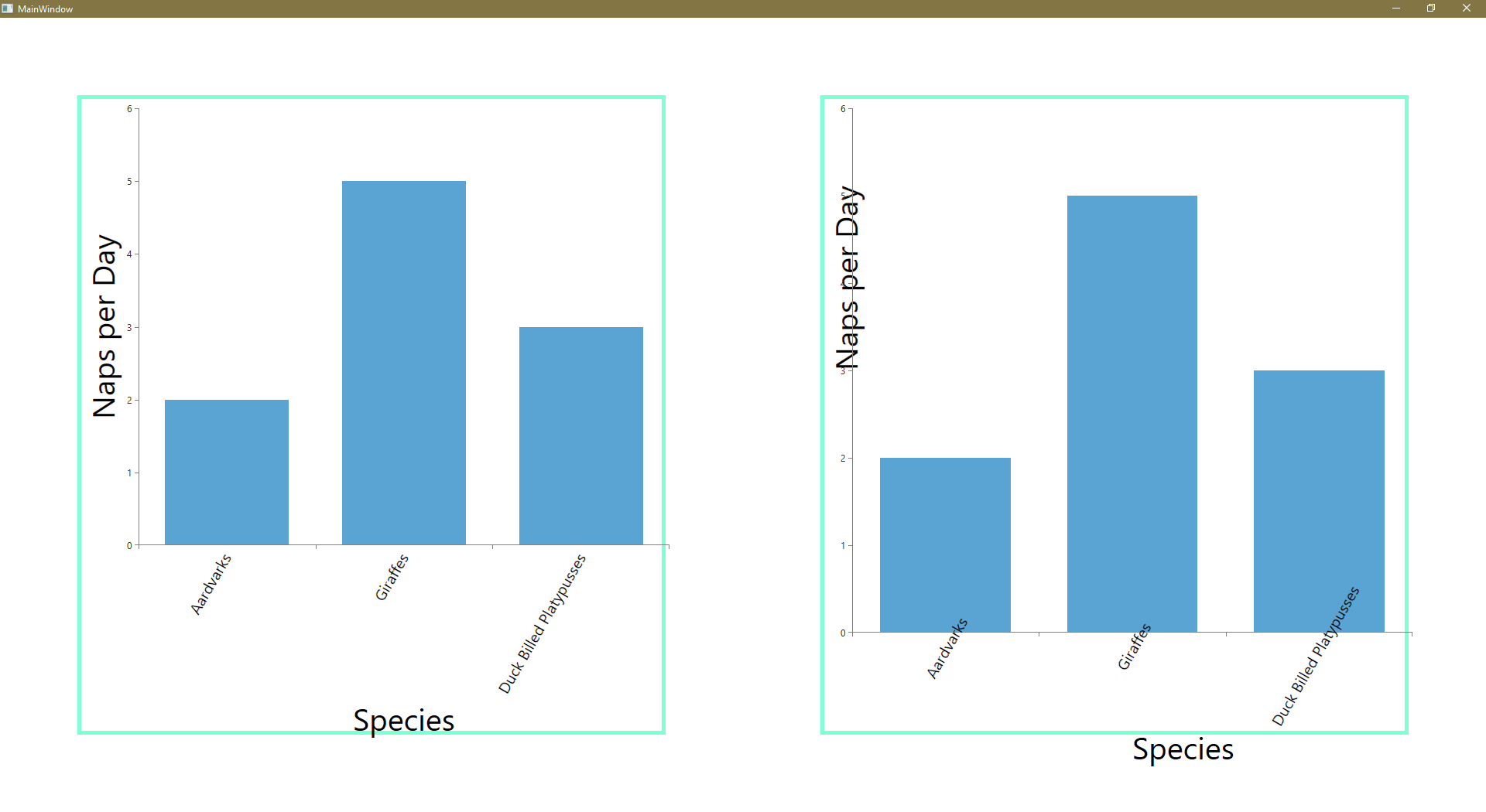 The attached screenshot shows the result. Please note that the aquamarine rectangle is the actual border of the chart, and that the ClipToBounds property is set to false, otherwise the title of the categorical axis would not be visible at all.
