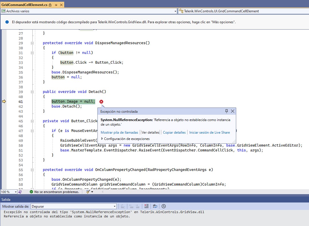 at Telerik.WinControls.UI.GridCommandCellElement.Detach() in Telerik.WinControls.UI\GridCommandCellElement.cs:line 41