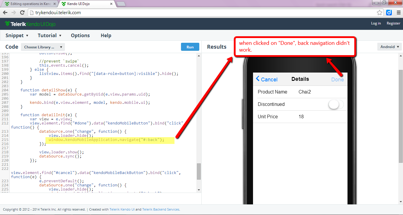 I was trying out listview Editing example(http://demos.telerik.com/kendo-ui/mobile/listview/editing.html) in Kendo UI Dojo but transition to previous view was not working on click of "Done" button. (Attached is a screenshot).