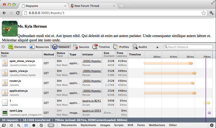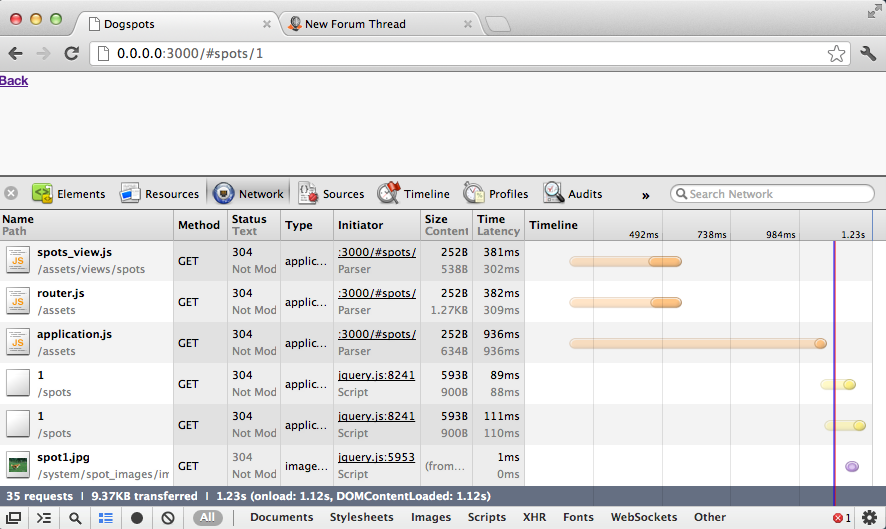 If I visit the Show-View for a selected Object (www.dogspots.de/#spots/1), my browser performs 2 JSON-Requests to the Server and I have an JS-Error: http://i48.tinypic.com/akbacn.png (Uncaught TypeError: Cannot call method 'getAttribute' of undefined)