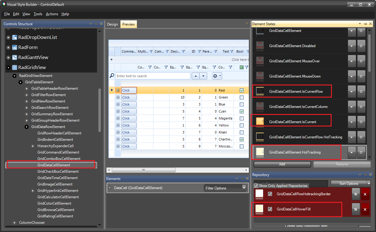 - same for the backcolor of the whole grid: there is a design0time BackColor on the RadRootElement, and this sometimes shows up in the designer, but not reliably. And I can't seem to set it at runtime either.
