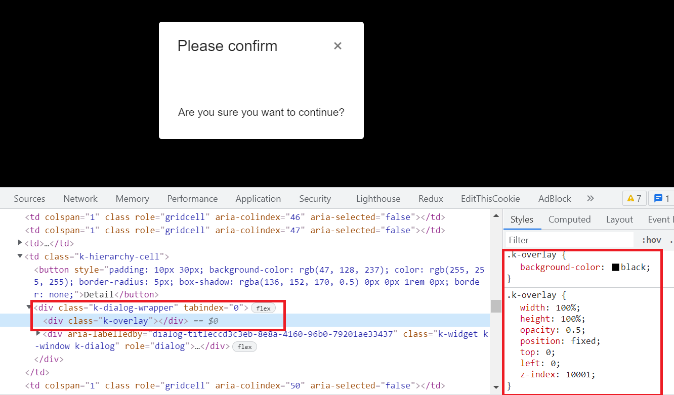 I'm using react kendo dialog but why am I getting a dark background screen, even though if I inspect the element style of kendo react it's correct. Please help with the solution