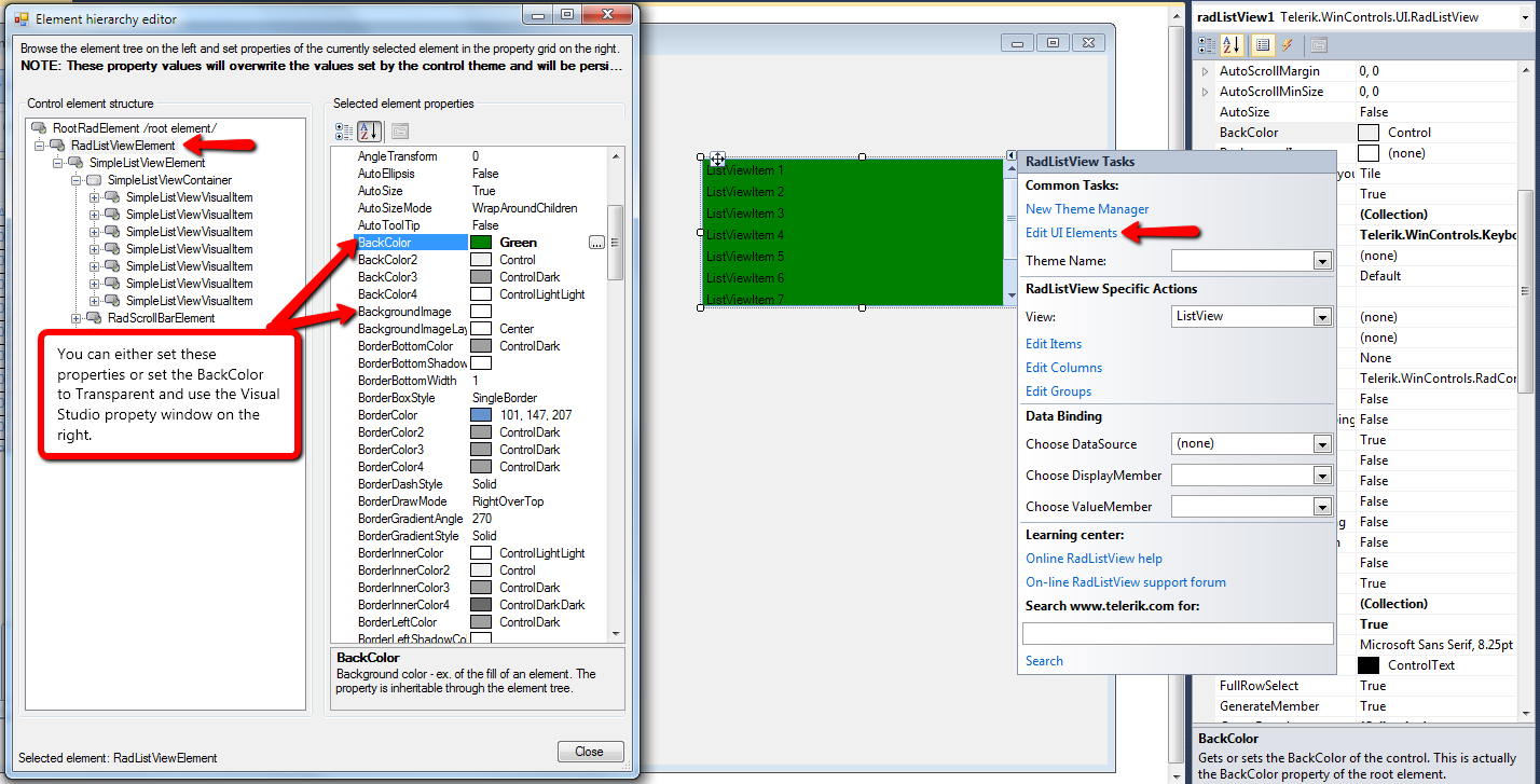 - the BackColor of the RadListView is still Lime, but the BackColor of RadListViewElement is reseted to White. <- Why?