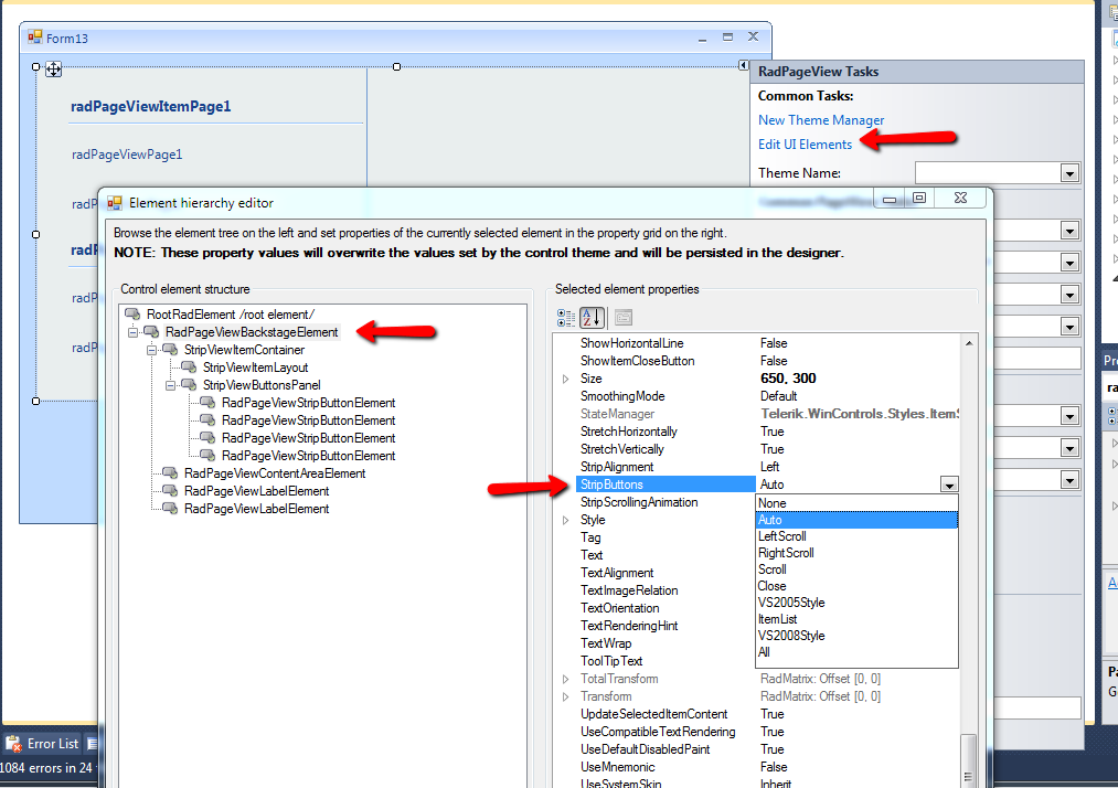 ((RadPageViewBackstageElement)this.radPageView1.ViewElement).StripButtons = StripViewButtons.Scroll;Alternatively, you can set it in Visual Studio's designer by using the Edit UI Elements button on the Smart tag menu of RadPageView. Please refer to the attached screenshot for additional details.
