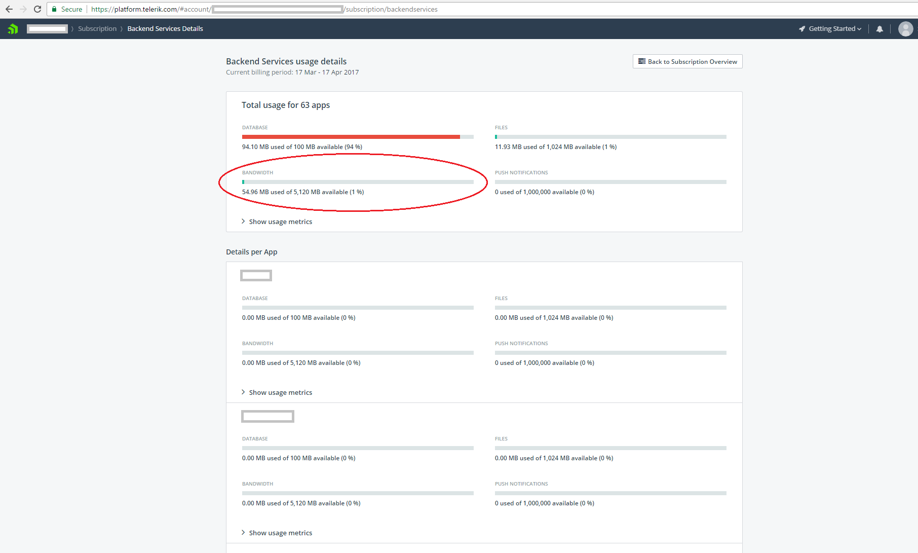 On the other screenshot, you have chosen to view the cumulative bandwidth - meaning values for each day are added to the values of the previous day. This page is the one you should look at, but please focus on the bar for bandwidth at the top - there is one at the very top of the page, which is for all your apps in total, and there is also one for each app, listed below the totals. Please view the attached screenshot for guidance - notice the URL, yours should be similar (just the id should be your account id) to make sure you are in the right place, and the bar circled in red should show your bandwidth usage for the current billing period.