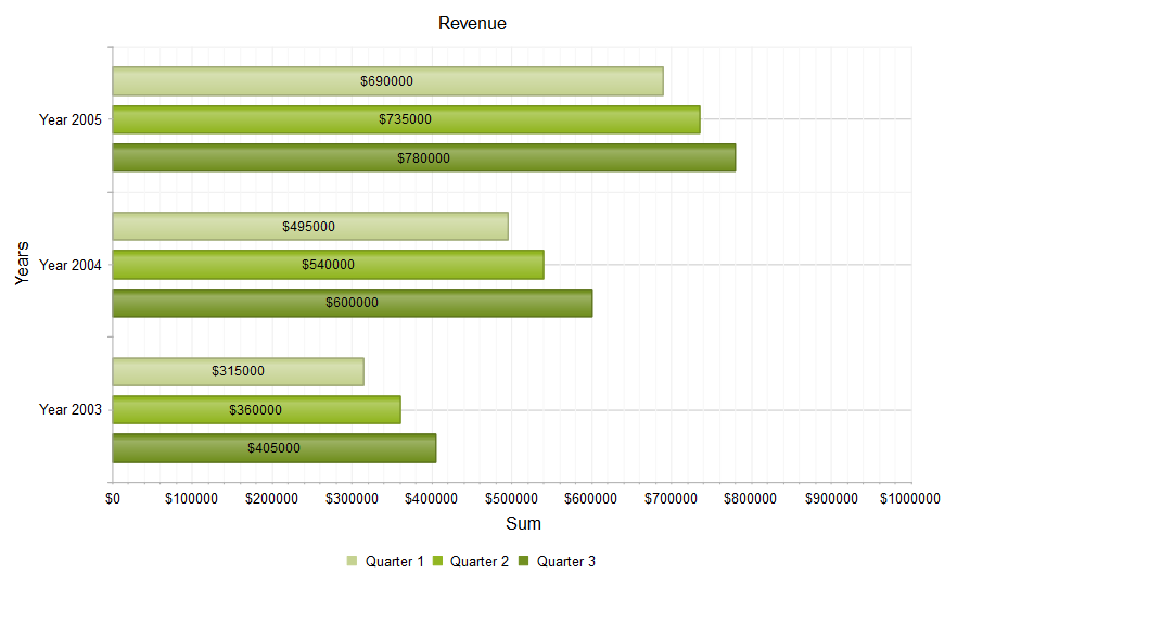<telerik:RadHtmlChart runat="server" ID="BarChart" Width="800" Height="500" Transitions="true"> <Appearance> <FillStyle BackgroundColor="White" /> </Appearance> <ChartTitle Text="Revenue"> <Appearance Align="Center" BackgroundColor="White" Position="Top" /> </ChartTitle> <Legend> <Appearance BackgroundColor="White" Position="Bottom" /> </Legend> <PlotArea> <Appearance> <FillStyle BackgroundColor="White" /> </Appearance> <XAxis AxisCrossingValue="0" Color="#b3b3b3" MajorTickType="Outside" MinorTickType="Outside" Reversed="true" > <Items> <telerik:AxisItem LabelText="2003" /> <telerik:AxisItem LabelText="2004" /> <telerik:AxisItem LabelText="2005" /> </Items> <LabelsAppearance DataFormatString="Year {0}" RotationAngle="0" /> <MajorGridLines Color="#EFEFEF" Width="1" /> <MinorGridLines Color="Black" Width="1" /> <TitleAppearance Position="Center" RotationAngle="0" Text="Years" /> </XAxis> <YAxis AxisCrossingValue="0" Color="#b3b3b3" MajorTickSize="1" MajorTickType="Outside" MaxValue="1000000" MinorTickSize="1" MinorTickType="Outside" MinValue="0" Reversed="false" Step="100000"> <LabelsAppearance DataFormatString="${0}" RotationAngle="0" /> <MajorGridLines Color="#EFEFEF" Width="1" /> <MinorGridLines Color="#F7F7F7" Width="1" /> <TitleAppearance Position="Center" RotationAngle="0" Text="Sum" /> </YAxis> <Series> <telerik:BarSeries Name="Quarter 1" Stacked="false"> <Appearance> <FillStyle BackgroundColor="#c5d291" /> </Appearance> <LabelsAppearance DataFormatString="${0}" Position="Center" /> <TooltipsAppearance BackgroundColor="#c5d291" DataFormatString="${0}" /> <Items> <telerik:SeriesItem YValue="315000" /> <telerik:SeriesItem YValue="495000" /> <telerik:SeriesItem YValue="690000" /> </Items> </telerik:BarSeries> <telerik:BarSeries Name="Quarter 2"> <Appearance> <FillStyle BackgroundColor="#92b622" /> </Appearance> <LabelsAppearance DataFormatString="${0}" Position="Center" /> <TooltipsAppearance BackgroundColor="#92b622" DataFormatString="${0}" /> <Items> <telerik:SeriesItem YValue="360000" /> <telerik:SeriesItem YValue="540000" /> <telerik:SeriesItem YValue="735000" /> </Items> </telerik:BarSeries> <telerik:BarSeries Name="Quarter 3"> <Appearance> <FillStyle BackgroundColor="#729021" /> </Appearance> <LabelsAppearance DataFormatString="${0}" Position="Center" /> <TooltipsAppearance BackgroundColor="#729021" DataFormatString="${0}" /> <Items> <telerik:SeriesItem YValue="405000" /> <telerik:SeriesItem YValue="600000" /> <telerik:SeriesItem YValue="780000" /> </Items> </telerik:BarSeries> </Series> </PlotArea></telerik:RadHtmlChart>Attached is the screenshot.