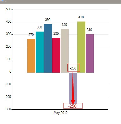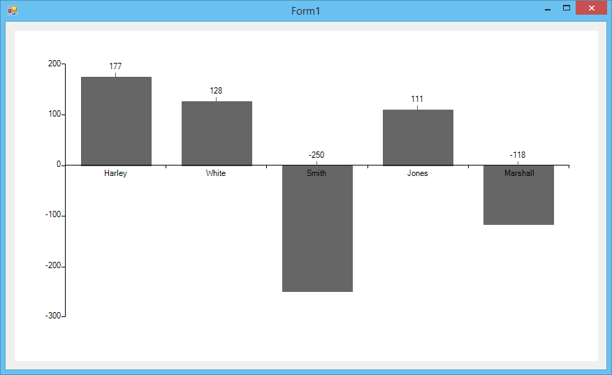 public partial class Form1 : Form{ public Form1() { InitializeComponent(); BarSeries barSeries = new BarSeries("Performance", "RepresentativeName"); barSeries.Name = "Q1"; barSeries.DataPoints.Add(new CategoricalDataPoint(177, "Harley")); barSeries.DataPoints.Add(new CategoricalDataPoint(128, "White")); barSeries.DataPoints.Add(new CategoricalDataPoint(-250, "Smith")); barSeries.DataPoints.Add(new CategoricalDataPoint(111, "Jones")); barSeries.DataPoints.Add(new CategoricalDataPoint(-118, "Marshall")); barSeries.ShowLabels = true; barSeries.DrawLinesToLabels = true; this.radChartView1.Series.Add(barSeries); CategoricalAxis axis = (CategoricalAxis)this.radChartView1.Axes[0]; axis.StartPositionAxis = this.radChartView1.Axes[1]; axis.StartPositionValue = 0; }}I am also attaching a screenshot showing the result on my end. In case you need further assistance, please share code snippet how you are generating the series and the settings you are using.