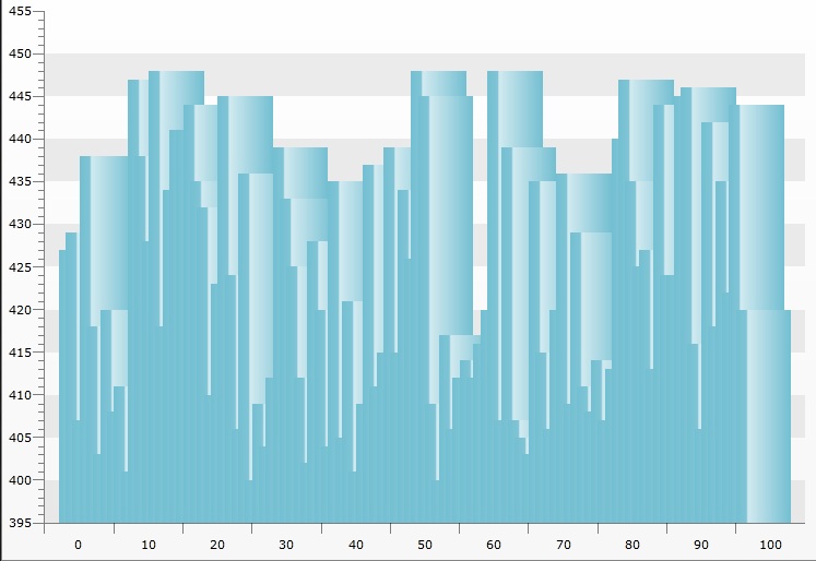 <Grid> <telerik:RadChart x:Name="ChartData"> <telerik:RadChart.SeriesMappings> <telerik:SeriesMapping> <telerik:SeriesMapping.SeriesDefinition> <telerik:BarSeriesDefinition ShowItemLabels="False" /> </telerik:SeriesMapping.SeriesDefinition> <telerik:SeriesMapping.ItemMappings> <telerik:ItemMapping DataPointMember="XValue" FieldName="Row" /> <telerik:ItemMapping DataPointMember="YValue" FieldName="Value" /> </telerik:SeriesMapping.ItemMappings> </telerik:SeriesMapping> </telerik:RadChart.SeriesMappings> </telerik:RadChart></Grid>public class Data{ public int Row { get; set; } public int Value { get; set; }}public partial class MainPage : UserControl{ private Random _rand = new Random(); public MainPage() { InitializeComponent(); List<Data> data = GenerateData().ToList(); ChartData.ItemsSource = data; } private IEnumerable<Data> GenerateData() { for (int i = 1; i < 100; ++i) { yield return new Data() { Row = i, Value = _rand.Next(400, 450) }; } }}
