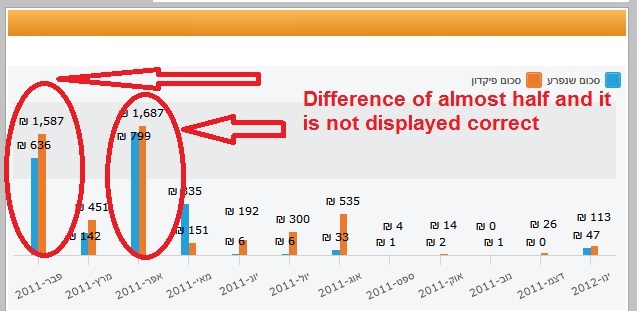 <telerik:RadChart x:Name="ReportChart" ItemsSource="{Binding PaymentsPerDateCollection}" LegendStyle="{StaticResource chartLegend}" Visibility="{Binding IsPaymentsPerDateChartVisible,Converter={StaticResource boolToVisibilityConverter}}"> <telerik:RadChart.SeriesMappings> <telerik:SeriesMapping LegendLabel="{Binding AppStrings.PaidAmount, Source={StaticResource StringsLocator}}"> <telerik:SeriesMapping.SeriesDefinition> <telerik:BarSeriesDefinition ItemLabelFormat="#Y{C0}" ItemStyle="{StaticResource paymentBarStyle}" SeriesItemLabelStyle="{StaticResource labelStyle}" /> </telerik:SeriesMapping.SeriesDefinition> <telerik:SeriesMapping.ItemMappings> <telerik:ItemMapping DataPointMember="YValue" FieldName="PaymentAmount" /> <telerik:ItemMapping DataPointMember="XCategory" FieldName="HandledOn" /> </telerik:SeriesMapping.ItemMappings> </telerik:SeriesMapping> <telerik:SeriesMapping LegendLabel="{Binding AppStrings.DepositAmount, Source={StaticResource StringsLocator}}"> <telerik:SeriesMapping.SeriesDefinition> <telerik:BarSeriesDefinition AxisName="Secondary" ItemLabelFormat="#Y{C0}" ItemStyle="{StaticResource depositBarStyle}" SeriesItemLabelStyle="{StaticResource labelStyle}" /> </telerik:SeriesMapping.SeriesDefinition> <telerik:SeriesMapping.ItemMappings> <telerik:ItemMapping DataPointMember="YValue" FieldName="DepositAmount" /> <telerik:ItemMapping DataPointMember="XCategory" FieldName="HandledOn" /> </telerik:SeriesMapping.ItemMappings> </telerik:SeriesMapping> </telerik:RadChart.SeriesMappings> <telerik:RadChart.DefaultView> <telerik:ChartDefaultView ChartLegendPosition="Top"> <!-- Title --> <telerik:ChartDefaultView.ChartTitle> <telerik:ChartTitle Visibility="Collapsed" /> </telerik:ChartDefaultView.ChartTitle> <!-- Legend --> <telerik:ChartDefaultView.ChartLegend> <telerik:ChartLegend> <telerik:ChartLegendItem Background="#25A0DA" Label="{Binding AppStrings.PaidAmount, Source={StaticResource StringsLocator}}" /> <telerik:ChartLegendItem Background="#EB7A2A" Label="{Binding AppStrings.DepositAmount, Source={StaticResource StringsLocator}}" /> </telerik:ChartLegend> </telerik:ChartDefaultView.ChartLegend> <!-- ChartArea --> <telerik:ChartDefaultView.ChartArea> <telerik:ChartArea ItemWidthPercent="30" LabelFormatBehavior="Scientific" SmartLabelsEnabled="True"> <!-- Axis X --> <telerik:ChartArea.AxisX> <telerik:AxisX DefaultLabelFormat="MMM-yyyy" IsDateTime="True" LabelRotationAngle="-25" LayoutMode="Inside"> </telerik:AxisX> </telerik:ChartArea.AxisX> <!-- Axis Y --> <telerik:ChartArea.AxisY> <telerik:AxisY DefaultLabelFormat="c" ExtendDirection="None" Visibility="Collapsed" /> </telerik:ChartArea.AxisY> <!-- Axis AdditionalYAxes --> <telerik:ChartArea.AdditionalYAxes> <telerik:AxisY AxisName="Secondary" DefaultLabelFormat="c" ExtendDirection="None" Visibility="Collapsed"> </telerik:AxisY> </telerik:ChartArea.AdditionalYAxes> </telerik:ChartArea> </telerik:ChartDefaultView.ChartArea> </telerik:ChartDefaultView> </telerik:RadChart.DefaultView> </telerik:RadChart>The strange thing is the height of the column does not really reflect the difference data