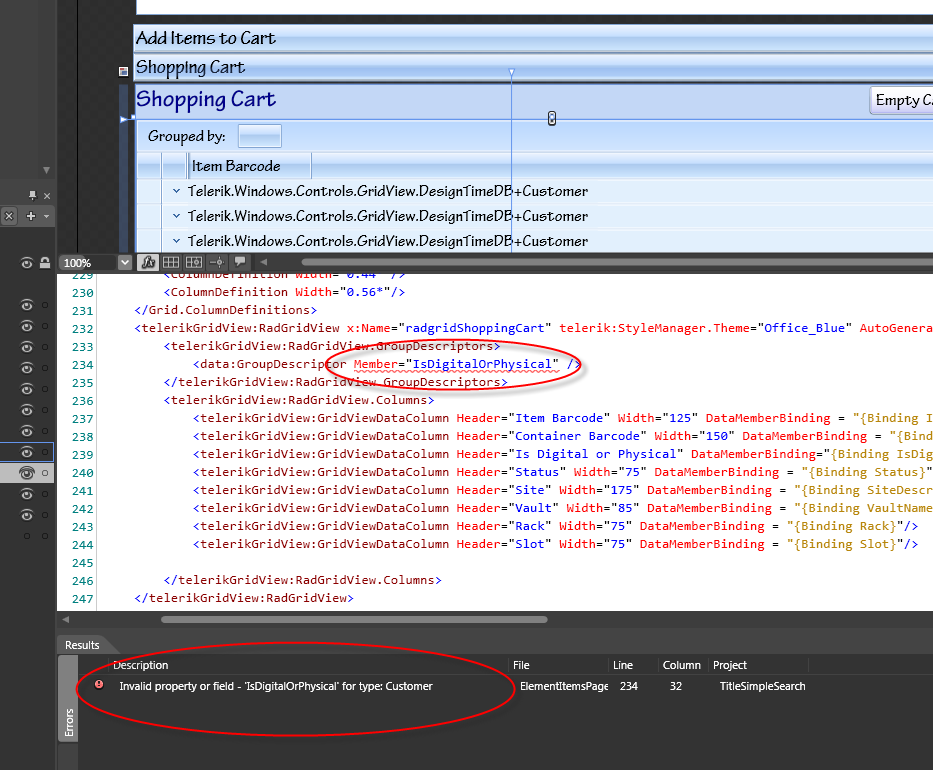 I know I am doing something stupid, but I can't get grouping to work on the Radgrid. I am trying to group by "IsDigitalOrPhysical" and Expression Blend tells me that it is not a correct property for "Customer" types. I don't even have a Customer type. See attached png please. I'm sure it's something painfully simple, but I can't get it to work.
