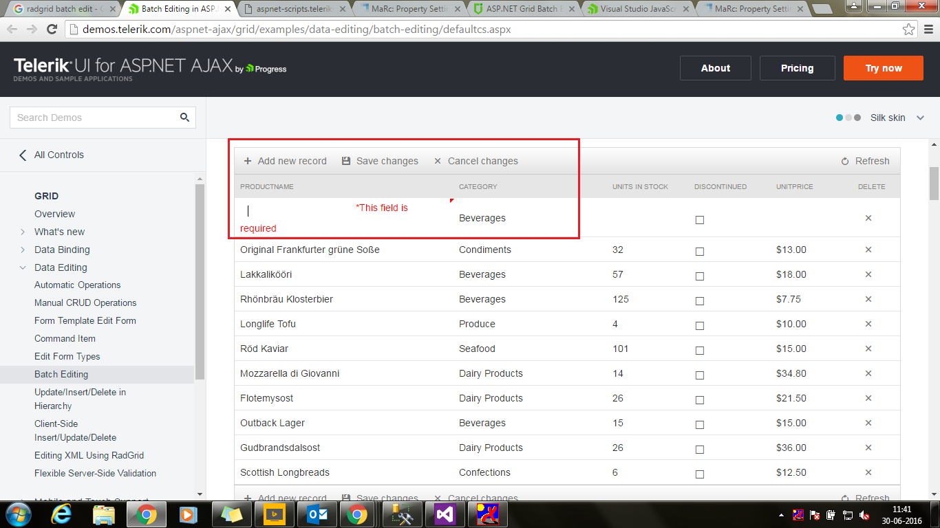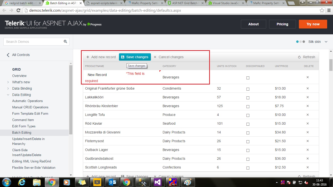 <telerik:GridBoundColumn DataField="ProductName" HeaderStyle-Width="210px" HeaderText="ProductName" SortExpression="ProductName" UniqueName="ProductName"> <ColumnValidationSettings EnableRequiredFieldValidation="true"> <RequiredFieldValidator ForeColor="Red" Text="*This field is required" Display="Dynamic"> </RequiredFieldValidator> </ColumnValidationSettings></telerik:GridBoundColumn><telerik:GridTemplateColumn HeaderText="UnitPrice" HeaderStyle-Width="80px" SortExpression="UnitPrice" UniqueName="TemplateColumn" DataField="UnitPrice"> <ItemTemplate> <asp:Label runat="server" ID="lblUnitPrice" Text='<%# Eval("UnitPrice", "{0:C}") %>'></asp:Label> </ItemTemplate> <EditItemTemplate> <span> <telerik:RadNumericTextBox RenderMode="Lightweight" Width="55px" runat="server" ID="tbUnitPrice"> </telerik:RadNumericTextBox> <span style="color: Red"> <asp:RequiredFieldValidator ID="RequiredFieldValidator1" ControlToValidate="tbUnitPrice" ErrorMessage="*Required" runat="server" Display="Dynamic"> </asp:RequiredFieldValidator> </span> </span> </EditItemTemplate></telerik:GridTemplateColumn>Regards the Enix's question please make sure you have some changes before you save them. Also you might experience such issue when you are using a template columns. I would recommend you to examine the following help article which elaborates more on handling such scenarios.