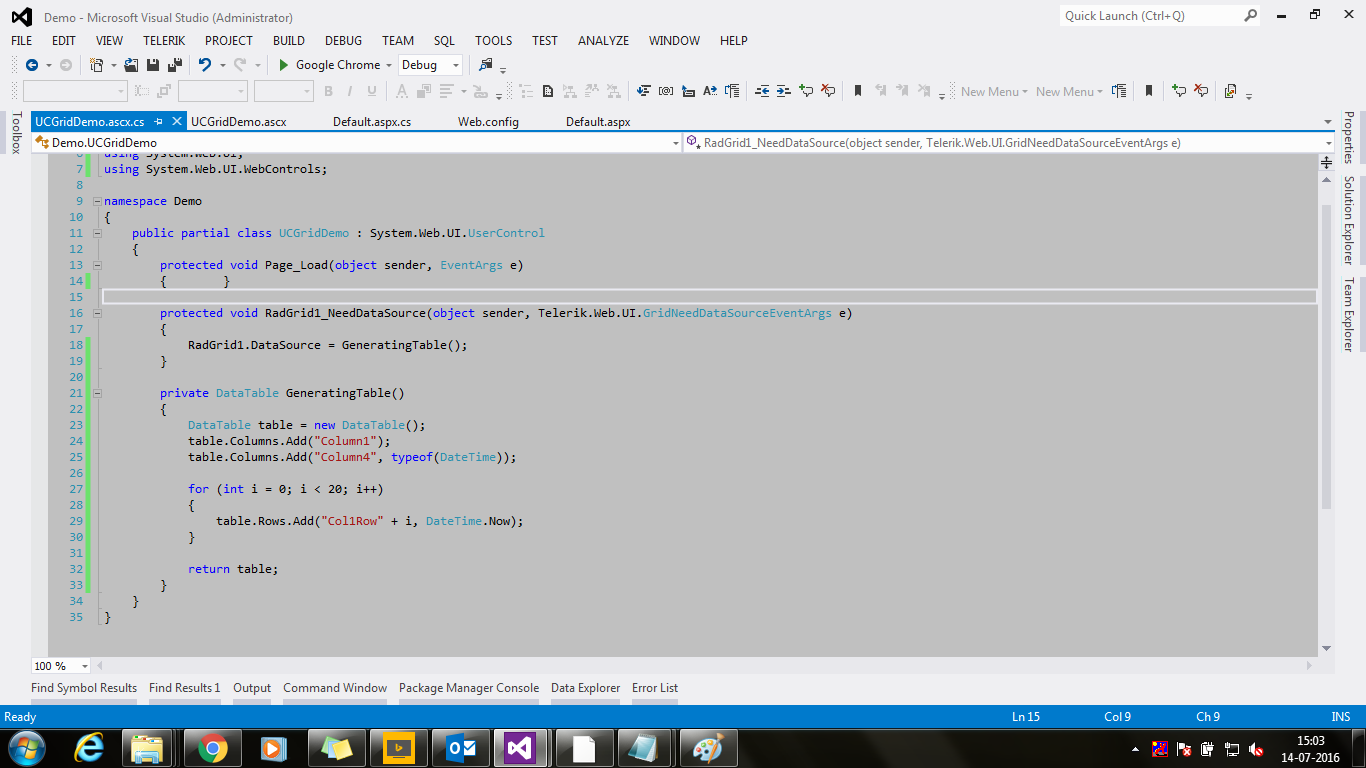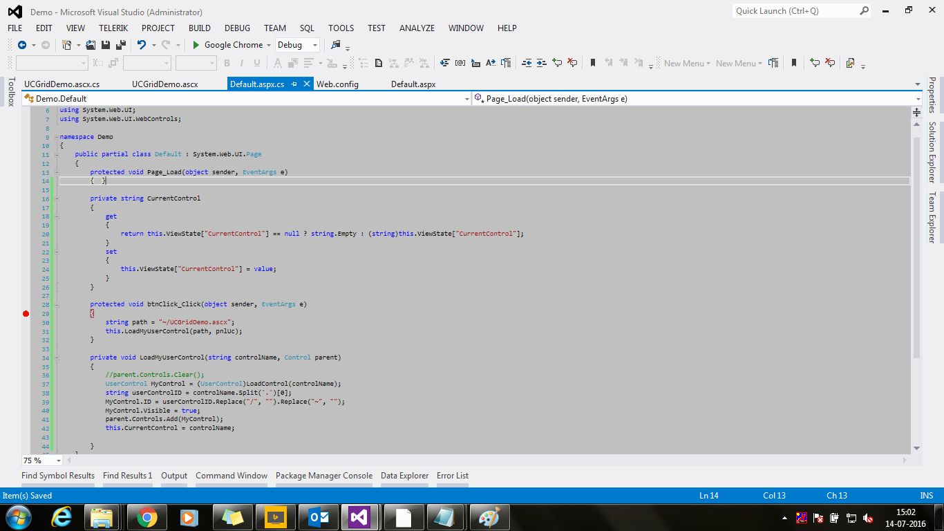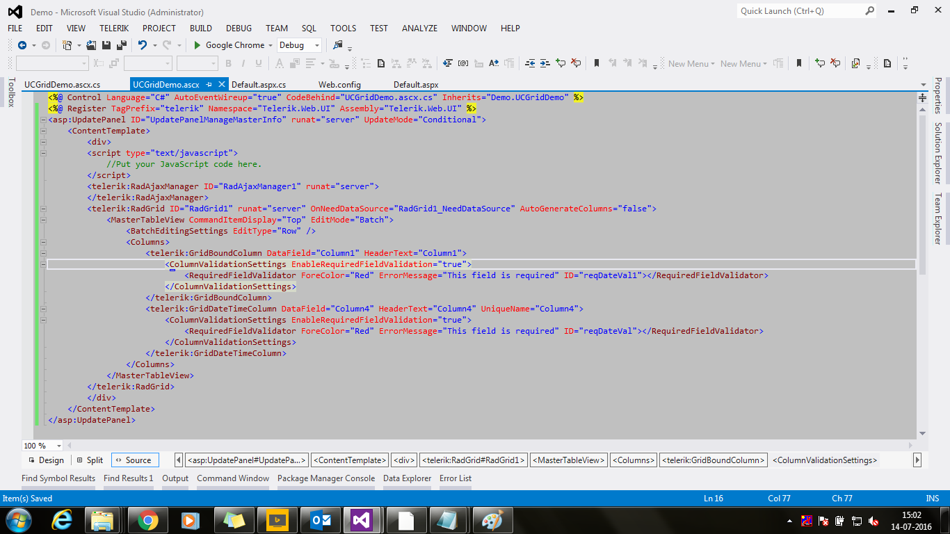 In this code I have page hierarchy as .aspx page - > .ascx page(loading dynamically on button click). In .ascx file I have RadGrid in BatchEdit mode having BoundColumns for which RequiredFieldValidator works properly.