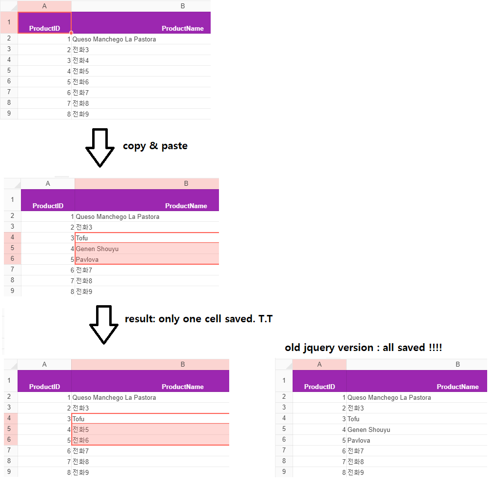 After multiple selection in Excel or Spreadsheet and copying If you paste and save, only one cell is saved. This is wrong.