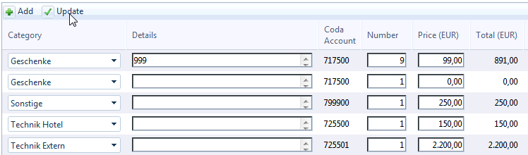 <telerik:RadGrid ID="RadGrid1" runat="server" AllowAutomaticInserts="True" CellSpacing="0" DataSourceID="SqlDataSource2" GridLines="None" ShowFooter="True" AllowAutomaticDeletes="True" AllowAutomaticUpdates="True" ShowStatusBar="True" AllowMultiRowEdit="True"> <ClientSettings> <Selecting AllowRowSelect="True" /> </ClientSettings><MasterTableView AutoGenerateColumns="False" DataKeyNames="kdId" DataSourceID="SqlDataSource2" CommandItemDisplay="Top" InsertItemPageIndexAction="ShowItemOnFirstPage" EditMode="InPlace"><CommandItemSettings ExportToPdfText="Export to PDF" AddNewRecordText="Add"></CommandItemSettings><RowIndicatorColumn FilterControlAltText="Filter RowIndicator column"><HeaderStyle Width="20px"></HeaderStyle></RowIndicatorColumn><ExpandCollapseColumn FilterControlAltText="Filter ExpandColumn column"><HeaderStyle Width="20px"></HeaderStyle></ExpandCollapseColumn> <Columns> <telerik:GridTemplateColumn DataField="ArtId" DataType="System.Int32" FilterControlAltText="Filter ArtId column" HeaderText="Category" SortExpression="ArtId" UniqueName="ArtId"> <EditItemTemplate> <telerik:RadComboBox ID="RadComboBox3" Runat="server" DataSourceID="SqlDataSource1" DataTextField="ArtName" DataValueField="ArtId" SelectedValue='<%# Bind("ArtId") %>'> </telerik:RadComboBox> </EditItemTemplate> <InsertItemTemplate> <telerik:RadComboBox ID="RadComboBox2" Runat="server" DataSourceID="SqlDataSource1" DataTextField="ArtName" DataValueField="ArtId" SelectedValue='<%# Bind("ArtId") %>' EmptyMessage="Add New Category"> </telerik:RadComboBox> </InsertItemTemplate> <ItemTemplate> <telerik:RadComboBox ID="RadComboBox1" Runat="server" DataSourceID="SqlDataSource1" DataTextField="ArtName" DataValueField="ArtId" SelectedValue='<%# Bind("ArtId") %>' onitemdatabound="RadComboBox1_ItemDataBound" onselectedindexchanged="RadComboBox1_SelectedIndexChanged" AutoPostBack="True"> </telerik:RadComboBox> </ItemTemplate> <HeaderStyle Width="80px" /> <ItemStyle Width="80px" /> </telerik:GridTemplateColumn> <telerik:GridTemplateColumn DataField="Info" FilterControlAltText="Filter Info column" HeaderText="Details" SortExpression="Info" UniqueName="Info"> <EditItemTemplate> <asp:TextBox ID="InfoTextBox" runat="server" Text='<%# Bind("Info") %>'></asp:TextBox> </EditItemTemplate> <InsertItemTemplate> <telerik:RadTextBox ID="Info" Runat="server" Height="15px" TextMode="MultiLine" Width="250px" Text='<%# Bind("Info") %>'> <ClientEvents OnBlur="Blur" OnFocus="Focus" /> </telerik:RadTextBox> </InsertItemTemplate> <ItemTemplate> <telerik:RadTextBox ID="Info" Runat="server" Height="15px" Text='<%# Bind("Info") %>' TextMode="MultiLine" Width="250px"> <ClientEvents OnBlur="Blur" OnFocus="Focus" /> </telerik:RadTextBox> </ItemTemplate> </telerik:GridTemplateColumn> <telerik:GridTemplateColumn FilterControlAltText="Filter CodaAccount column" HeaderText="Coda Account" UniqueName="CodaAccount" ReadOnly="True"> <InsertItemTemplate> <asp:Label ID="Label1" runat="server"></asp:Label> </InsertItemTemplate> <ItemTemplate> <asp:Label ID="CodaAccount" runat="server" Text="Label"></asp:Label> </ItemTemplate> <HeaderStyle Width="60px" /> <ItemStyle Width="60px" /> </telerik:GridTemplateColumn> <telerik:GridTemplateColumn DataField="Anzahl" DataType="System.Int32" FilterControlAltText="Filter Anzahl column" HeaderText="Number" SortExpression="Anzahl" UniqueName="Anzahl"> <EditItemTemplate> <telerik:RadNumericTextBox ID="Anzahl" Runat="server" Culture="de-DE" DbValue='<%# Bind("Anzahl") %>' Width="50px"> <EnabledStyle HorizontalAlign="Right" /> </telerik:RadNumericTextBox> </EditItemTemplate> <InsertItemTemplate> <telerik:RadNumericTextBox ID="Anzahl" Runat="server" Culture="de-DE" Width="50px" DbValue='<%# Bind("Anzahl") %>'> <NumberFormat DecimalDigits="0" /> <EnabledStyle HorizontalAlign="Right" /> </telerik:RadNumericTextBox> </InsertItemTemplate> <ItemTemplate> <telerik:RadNumericTextBox ID="Anzahl" Runat="server" Culture="de-DE" DbValue='<%# Bind("Anzahl") %>' Width="50px"> <NumberFormat DecimalDigits="0" /> <EnabledStyle HorizontalAlign="Right" /> </telerik:RadNumericTextBox> </ItemTemplate> <HeaderStyle Width="50px" /> <ItemStyle Width="50px" HorizontalAlign="Right" /> </telerik:GridTemplateColumn> <telerik:GridTemplateColumn DataField="Preis" DataType="System.Decimal" FilterControlAltText="Filter Preis column" HeaderText="Price" SortExpression="Preis" UniqueName="Preis" FooterText="Total:"> <EditItemTemplate> <asp:TextBox ID="PreisTextBox" runat="server" Text='<%# Bind("Preis") %>'></asp:TextBox> </EditItemTemplate> <InsertItemTemplate> <telerik:RadNumericTextBox ID="Preis" Runat="server" Culture="de-DE" Width="60px" DbValue='<%# Bind("Preis") %>'> <EnabledStyle HorizontalAlign="Right" /> </telerik:RadNumericTextBox> </InsertItemTemplate> <ItemTemplate> <telerik:RadNumericTextBox ID="Preis" Runat="server" Culture="de-DE" DbValue='<%# Bind("Preis") %>' Width="60px"> <EnabledStyle HorizontalAlign="Right" /> </telerik:RadNumericTextBox> </ItemTemplate> <FooterStyle Font-Bold="True" HorizontalAlign="Right" /> <HeaderStyle Width="60px" /> <ItemStyle Width="60px" /> </telerik:GridTemplateColumn> <telerik:GridTemplateColumn FilterControlAltText="Filter Total column" HeaderText="Total" UniqueName="Total" ReadOnly="True"> <InsertItemTemplate> <asp:LinkButton ID="Insert" runat="server" CommandName="PerformInsert" ToolTip="Insert"><img src="Image/AddRecord.gif" alt="Insert" style="border-style:none"/></asp:LinkButton> <asp:LinkButton ID="Cancel" runat="server" CommandName="Cancel" ToolTip="Cancel"><img src="Image/Cancel.gif" alt="Cancel" style="border-style:none"/></asp:LinkButton> </InsertItemTemplate> <ItemTemplate> <asp:Label ID="lblTotal" runat="server" Width="60px" CssClass="lblCSSright"></asp:Label> </ItemTemplate> <FooterStyle Font-Bold="True" HorizontalAlign="Right" /> <HeaderStyle Width="60px" /> <ItemStyle Width="60px" /> </telerik:GridTemplateColumn> <telerik:GridEditCommandColumn FilterControlAltText="Filter EditCommandColumn column"> </teleri