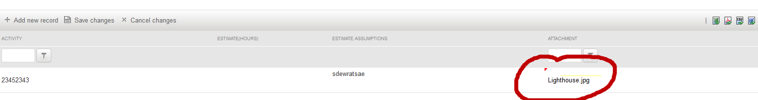 <telerik:RadGrid ID="gridProjectManagement" GridLines="None" runat="server" AllowAutomaticDeletes="false" AllowAutomaticInserts="True" AllowSorting="true" AllowFilteringByColumn="true" FilterType="CheckList" EnableLinqExpressions="false" OnItemCreated="gridProjectManagement_ItemCreated" OnPreRender="gridProjectManagement_PreRender" AllowAutomaticUpdates="True" AutoGenerateColumns="False" OnBatchEditCommand="gridProjectManagement_BatchEditCommand" OnItemCommand="gridProjectManagement_ItemCommand" OnNeedDataSource="gridProjectManagement_NeedDataSource" OnItemDataBound="gridProjectManagement_ItemDataBound" > <ExportSettings ExportOnlyData="true" HideStructureColumns="true" OpenInNewWindow="true" IgnorePaging="true"><Excel Format="Html" /></ExportSettings> <MasterTableView CommandItemDisplay="Top" DataKeyNames="ID" Font-Size="Small" CommandItemSettings-ShowAddNewRecordButton="false" CommandItemSettings-ShowRefreshButton="false" HorizontalAlign="NotSet" EditMode="Batch" AutoGenerateColumns="False" AllowFilteringByColumn="True"> <CommandItemSettings ShowExportToCsvButton="true" ShowExportToExcelButton="true" ShowAddNewRecordButton="true" ShowExportToPdfButton="true" ShowExportToWordButton="true" /> <BatchEditingSettings EditType="Cell" OpenEditingEvent="Click" /> <%-- <SortExpressions> <telerik:GridSortExpression FieldName="PerspModel_ID" SortOrder="Descending" /> </SortExpressions>--%> <Columns> <telerik:GridBoundColumn DataField="ID" ForceExtractValue="Always" Display="false" HeaderText="ID" UniqueName="ID"> </telerik:GridBoundColumn> <telerik:GridBoundColumn DataField="Activity" AllowSorting="true" SortExpression="Activity" HeaderStyle-Width="150px" HeaderText="Activity" UniqueName="Activity"> </telerik:GridBoundColumn> <telerik:GridNumericColumn DataField="Estimate" HeaderStyle-Width="80px" AllowFiltering="false" AllowSorting="false" DataType="System.Decimal" DecimalDigits="1" HeaderText="Estimate(hours)" SortExpression="Estimate" UniqueName="Estimate"> </telerik:GridNumericColumn> <telerik:GridTemplateColumn ColumnEditorID="EstimateAssumptions" ItemStyle-CssClass="breakWord120" UniqueName="EstimateAssumptions" ItemStyle-Width="100px" AllowFiltering="false" HeaderStyle-Width="150px" HeaderText="Estimate Assumptions"> <ItemTemplate> <%# Eval("EstimateAssumptions")%> </ItemTemplate> <EditItemTemplate> <telerik:RadTextBox ID="txtEditEstimateAssumptions" Height="50px" Wrap="true" TextMode="MultiLine" ToolTip='<%# Eval("EstimateAssumptions")%>' runat="server" Text='<%# Eval("EstimateAdjustmentRationale")%>'></telerik:RadTextBox> </EditItemTemplate> </telerik:GridTemplateColumn> <telerik:GridAttachmentColumn EditFormHeaderTextFormat="Upload File:" HeaderStyle-Width="150px" HeaderText="Attachment" AttachmentDataField="Attachment" AttachmentKeyFields="ID" FileNameTextField="FileName" DataTextField="FileName" UniqueName="Attachment"> </telerik:GridAttachmentColumn> </Columns> </MasterTableView> <ClientSettings> <Scrolling AllowScroll="true" UseStaticHeaders="true" ScrollHeight="300px" SaveScrollPosition="true"></Scrolling> <%-- <ClientEvents OnBatchEditOpened="OnBatchEditOpened" OnBatchEditOpening="BatchEditOpening" />--%> <%-- <ClientEvents OnCommand="gridCommand"></ClientEvents>--%> </ClientSettings> </telerik:RadGrid>