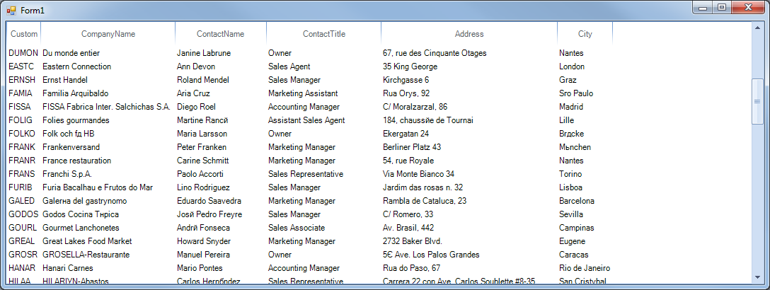 public Form1(){ InitializeComponent(); this.radListView1.DataSource = this.customersBindingSource; this.radListView1.ViewType = ListViewType.DetailsView;}private void Form1_Load(object sender, EventArgs e){ this.customersTableAdapter.Fill(this.nwindDataSet.Customers); foreach (ListViewDetailColumn c in this.radListView1.Columns) { c.BestFit(); }}I hope this information helps. Should you have further questions, I would be glad to help.