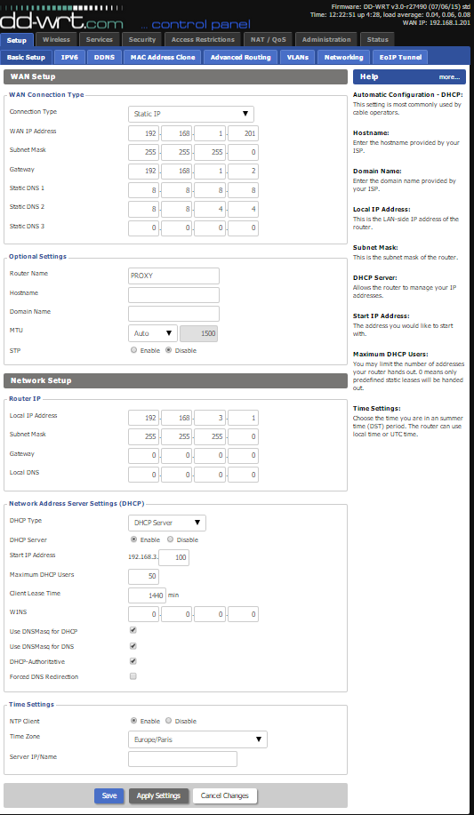 You need to configure the router so that the gateway value points to the transparent router host ip (192.168.1.2). To do so, assign a static IP address for the WAN. Use an ip which is outside of the LAN's DHCP range, often 192.168.1.201 is good. Router's WAN automatic DHCP assignment can't be used because it will also assign the ​default gateway (usually 192.168.1.1), which in this case won't be the desired proxy host address (192.168.1.2). Hence we are using the router's static IP WAN option to assign a WAN address. Attached is a screen shot image of my dd-wrt setup. The image shows a static IP of 192.168.1.201, a gateway of 192.168.1.2, some google DNS addresses. The router will use a private network of 192.168.3.1.