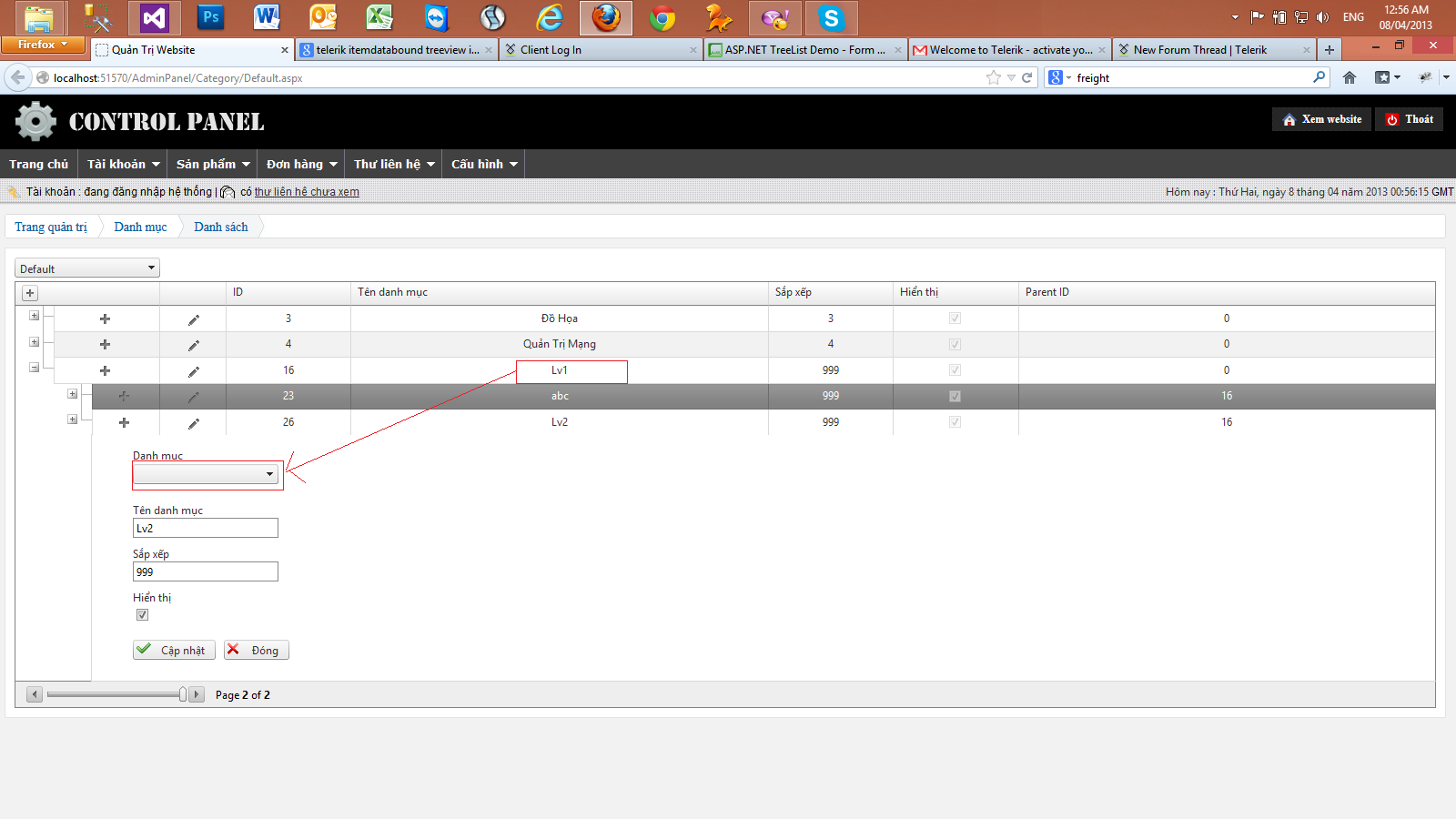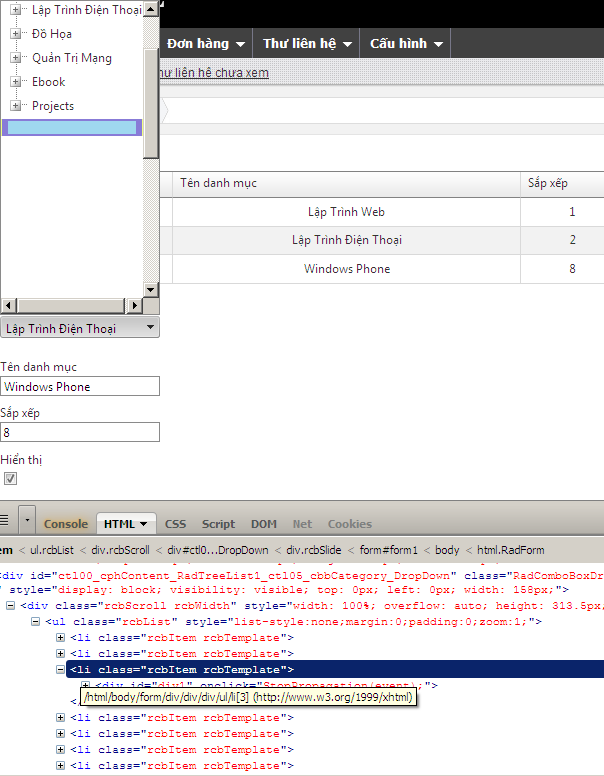 <EditFormSettings EditFormType="Template"> <FormTemplate> <div id="frmTemp"> <div class="frmTemp_left"> <label>Danh mục</label> <div> <telerik:RadComboBox ID="cbbCategory" runat="server" AppendDataBoundItems="true"> <ItemTemplate> <div id="div1" onclick="StopPropagation(event);" > <telerik:RadTreeView ID="trvCategory" runat="server" DataFieldID="CategoryId" DataFieldParentID="ParentId" DataTextField="CateName" DataValueField="CategoryId" OnClientNodeClicking="nodeClicking" > </telerik:RadTreeView> </div> </ItemTemplate> <Items> <telerik:RadComboBoxItem Text="" Value="" Selected="True"></telerik:RadComboBoxItem> </Items> </telerik:RadComboBox> </div> <label>Tên danh mục</label> <div> <asp:TextBox ID="txtCateName" runat="server" Text='<%# Bind("CateName") %>'></asp:TextBox> </div> <label>Sắp xếp</label> <div> <asp:TextBox ID="txtOrderBy" runat="server" Text='<%# Bind("OrderBy") %>'></asp:TextBox> </div> <label>Hiển thị</label> <div> <asp:CheckBox ID="ckbActive" runat="server" Checked='<%# ((Container is TreeListEditFormInsertItem) ? false : Eval("Active")) %>' /> </div> <div style="padding-top: 10px;"> <asp:HiddenField ID="HiddenField2" runat="server" Value='<%# Eval("ParentId") %>' /> <asp:HiddenField ID="HiddenField1" runat="server" Value='<%# Eval("CategoryId") %>' /> <telerik:RadButton ID="btnUpdate" Text='<%# (Container is TreeListEditFormInsertItem) ? "Lưu" : "Cập nhật" %>' runat="server" CommandName='<%# (Container is TreeListEditFormInsertItem) ? "PerformInsert" : "Update" %>' Icon-PrimaryIconCssClass="rbOk"> </telerik:RadButton> <telerik:RadButton ID="btnCancel" Text="Đóng" runat="server" CausesValidation="False" CommandName="Cancel" Icon-PrimaryIconCssClass="rbCancel"> </telerik:RadButton> </div> </div> </div> </FormTemplate> </EditFormSettings>