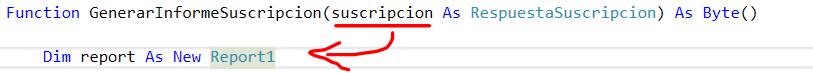 How do I pass the suscripcion object to the report1 to show the fields, as in the suscrip.png image?