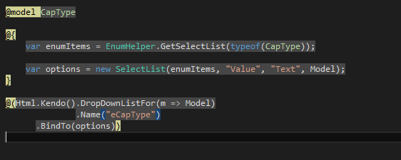 I'm trying to bind a Kendo.Dropdownlist to an enum in MVC but cant seem to get it working. It binds OK to get the values but when I change the value its not reflected in the ViewModel. I have attached two screenshots of my editor template (one working and one not). The one that works use the built in EnumDropdownListFor but this doesn't have the styling like the Kendo UI. Any ideas how i can get the Kendo dropdown to work?