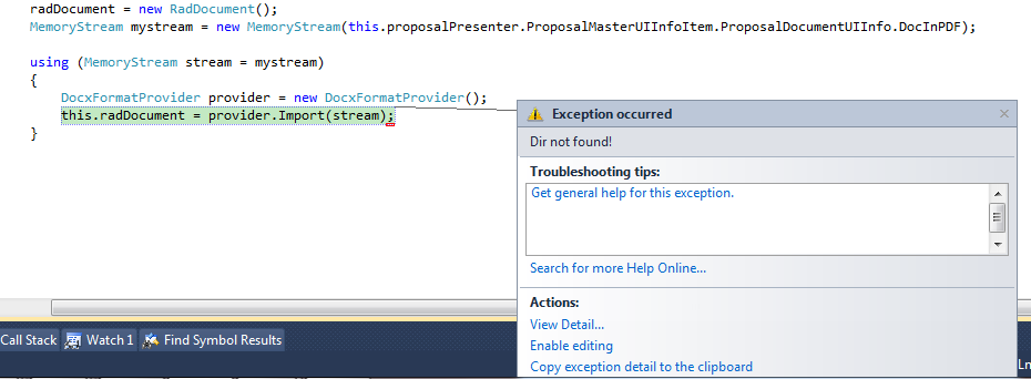 this.radDocument = provider.Import(stream); ....ERROR : Dir not found!
